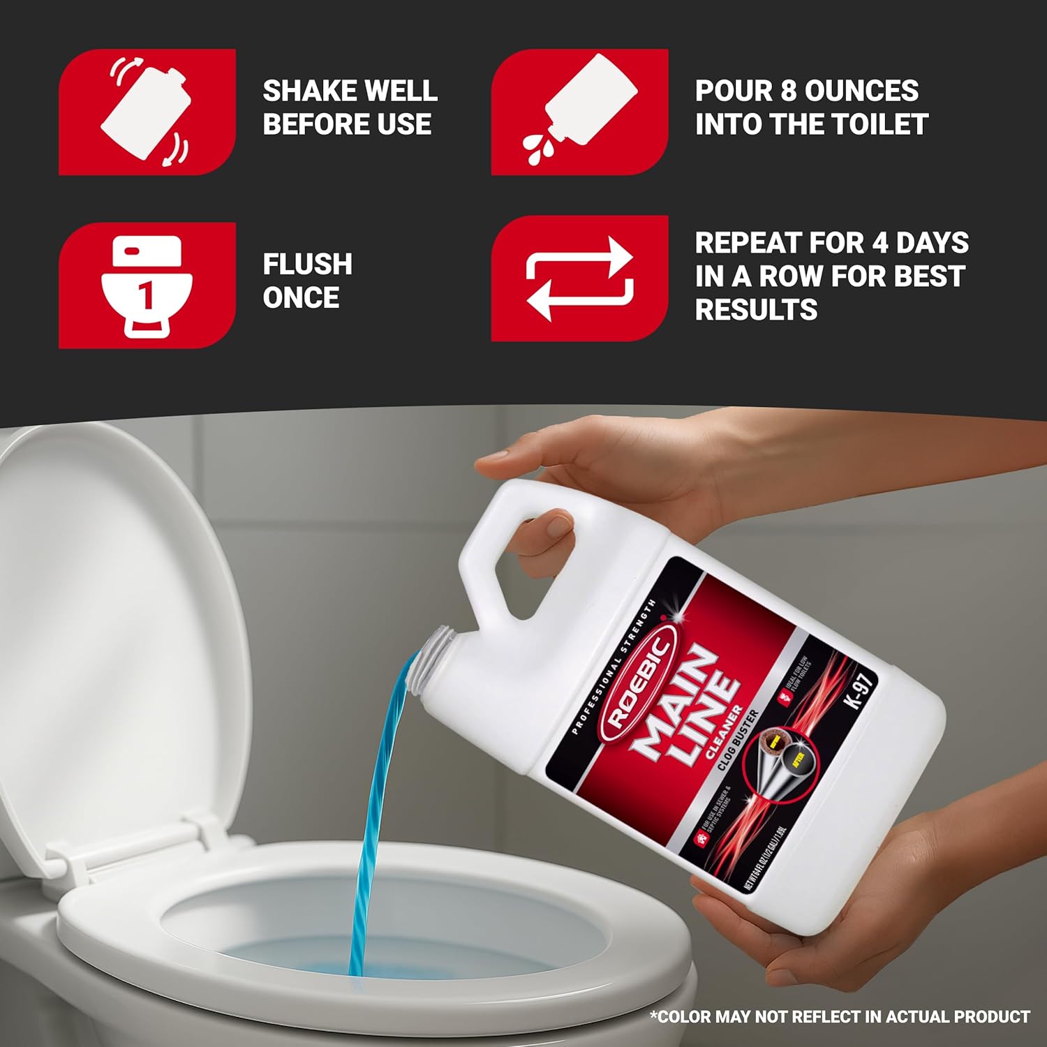 Roebic K-97 Liquid Main Line Cleaner with Bacteria Enzymes, Eliminates Organic Buildup in Sewer/Septic System and Protects from Clogs, Safe for Bathroom Toilet, 64 fl oz