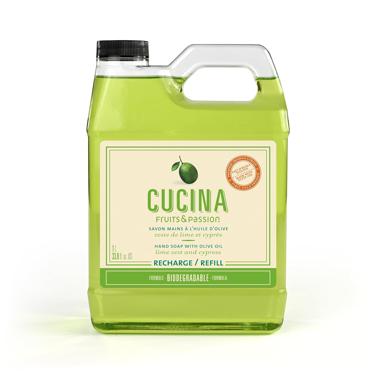 Cucina Fruits & Passion Hand Soap Refill – 1 Liter (33.8 oz) Lime Zest and Cypress – Purifying All Natural Kitchen Hand Soap with Olive Oil – Vegan and Moisturizing Formula