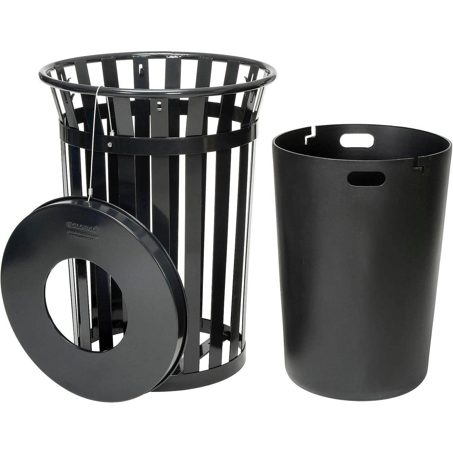 Global Industrial 36 Gallon Outdoor Slatted Steel Round Trash Can with Flat Lid, Plastic Liner & Anchor Kit Included, 28" W x 36" H, Commercial & Industrial Trash Can, Black