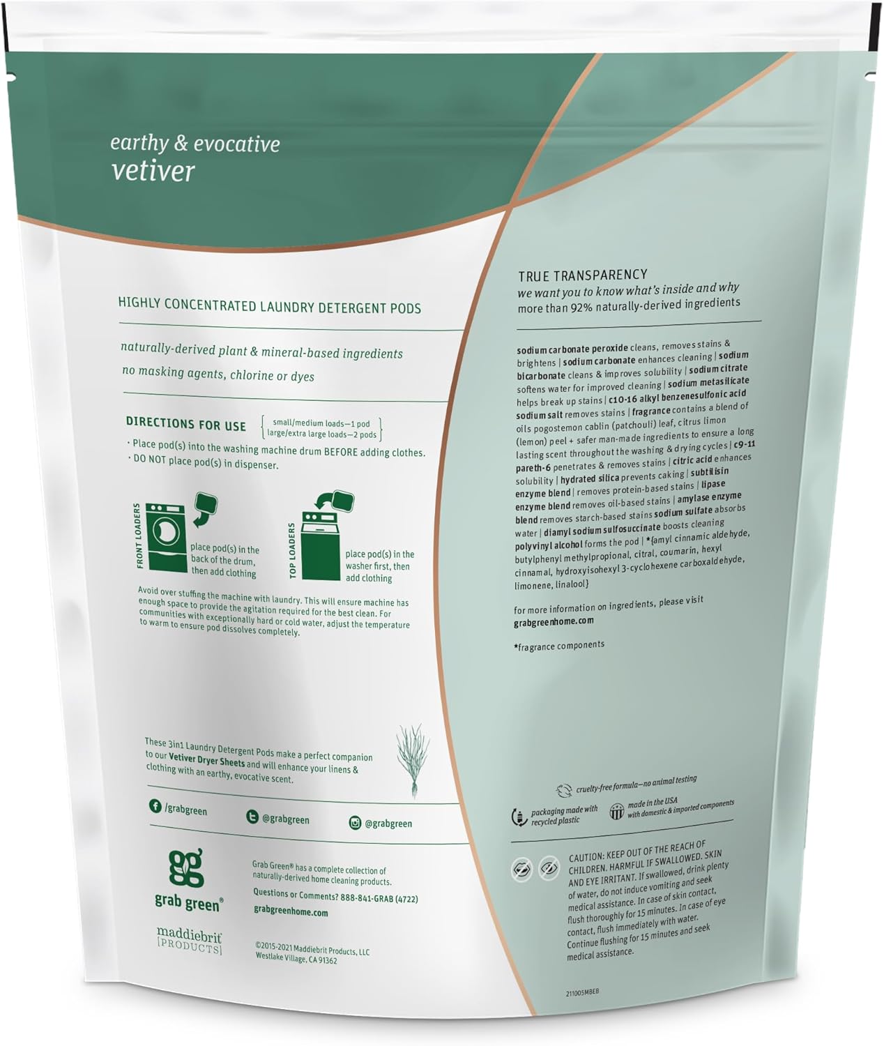 • Contains: 1- 60 Pod Bag of Grab Green Natural Vetiver 3in1 Laundry Detergent Pods. Our velcro closure bags are convenient and easy to use, no hassling with frustrating zip closures