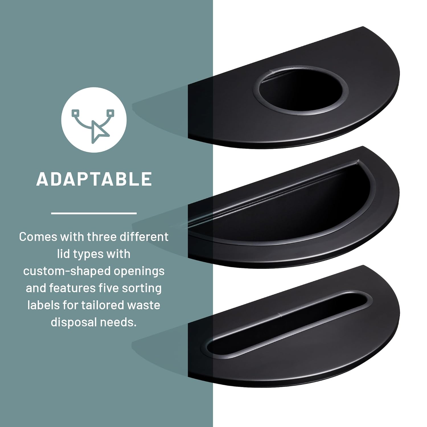 • 3 LIDS WITH DECALS. Receptacle includes 3 lids to help encourage recycling. Horizontal slot collects papers, newspapers and magazines. Round indicates cans and bottles, and half-circle gathers general recycling or trash. Includes Cans, Paper and Recycle decals.