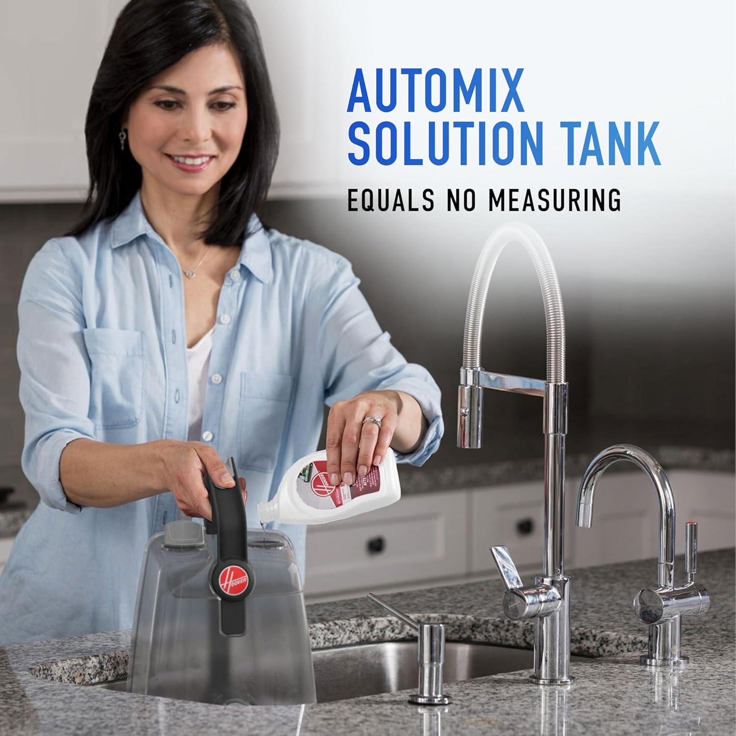 • AUTO MIX: This Hoover carpet cleaner machine has an Auto Mix feature that precisely mixes and dispenses solution for optimal carpet washing. Package includes upholstery tool, pet tool, crevice tool, 8 ft. hose, sample solution.