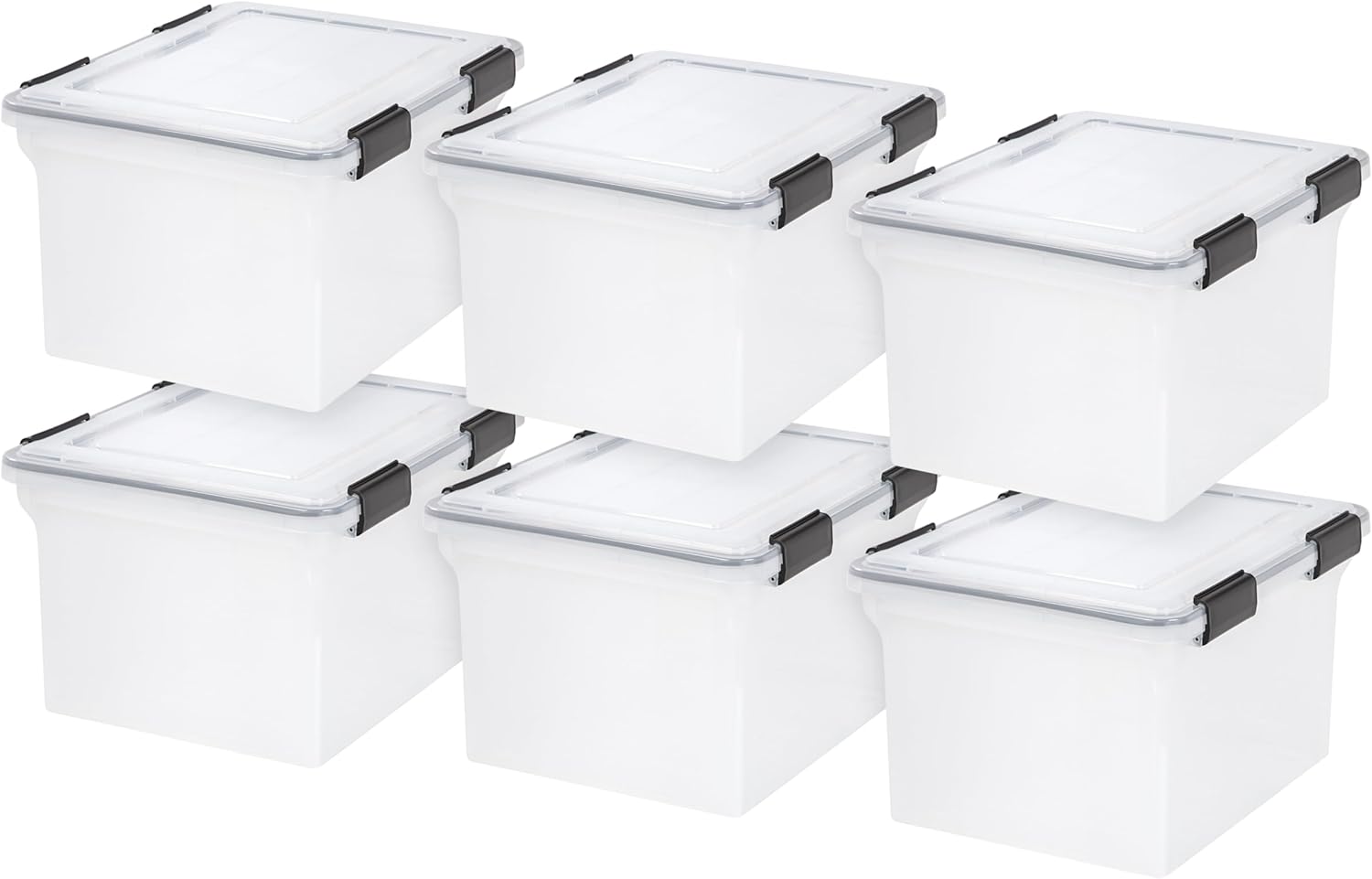 IRIS USA 32 Quart WEATHERPRO Plastic Storage Box with Durable Lid and Seal and Secure Latching Buckles, Clear with Black Buckles, 6 Pack