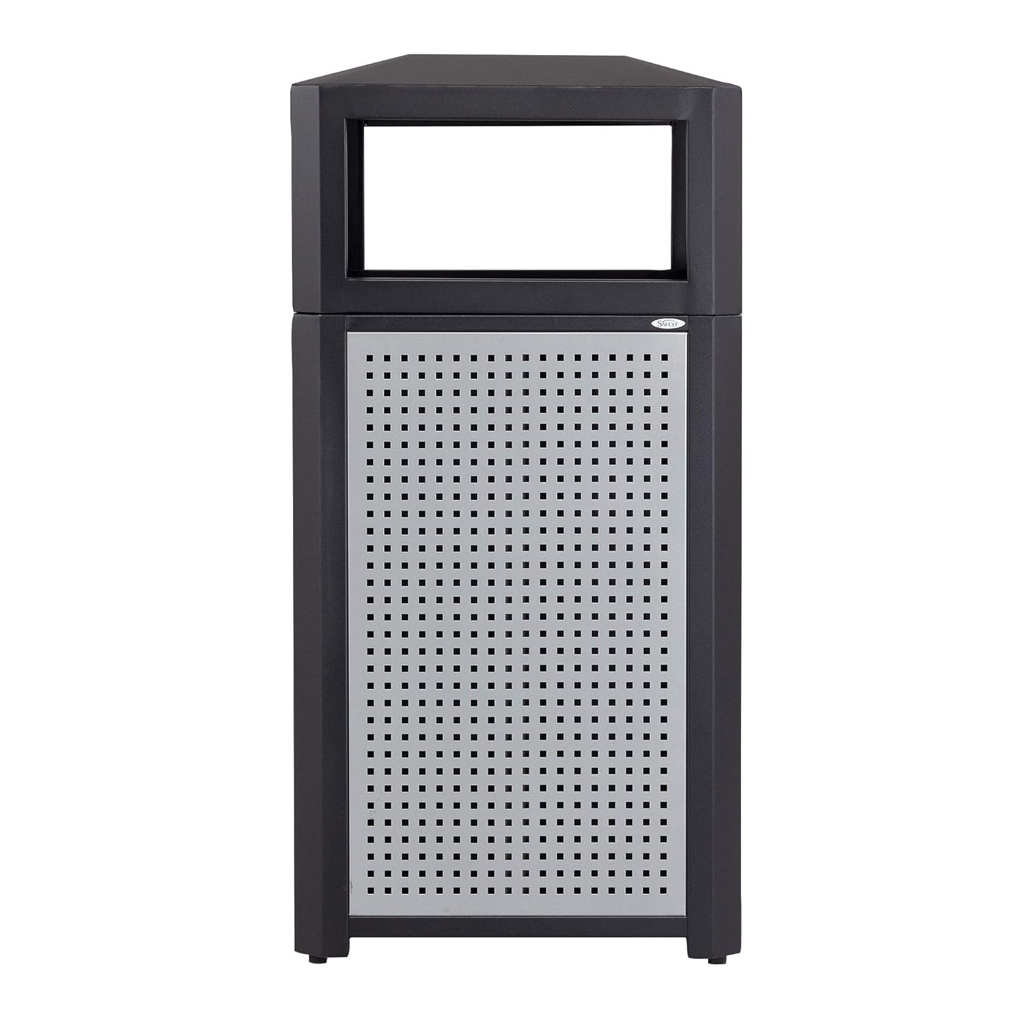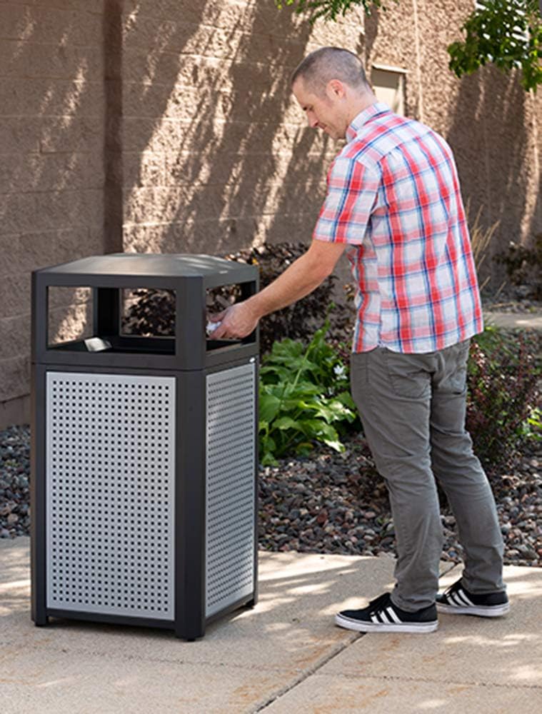 • MODERN STYLING. Evos Outdoor and Indoor Steel Trash Can features four stylish perforated panels on a heavy-duty steel frame with a galvanized base to resist rust and corrosion while keeping high traffic areas clean and litter free.