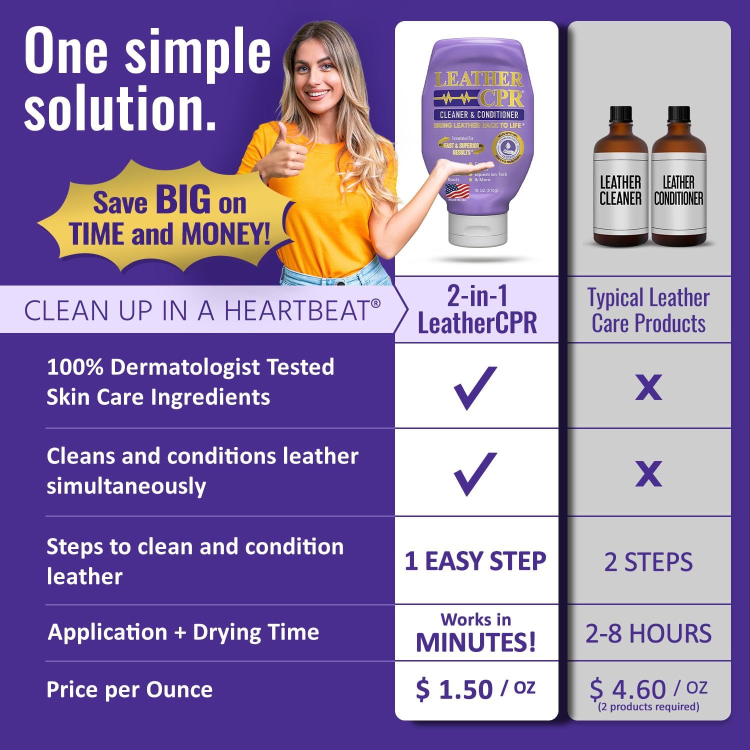 • PREMIUM LEATHER CARE SOLUTION: Leather CPR leather cleaner and conditioner is ideal for maintaining leather’s texture and appearance, from leather couches and furniture to purses and shoes. Whether you need a leather couch cleaner and conditioner, a leather conditioner for purses, or leather cleaner for couches, our product delivers long-lasting results.
