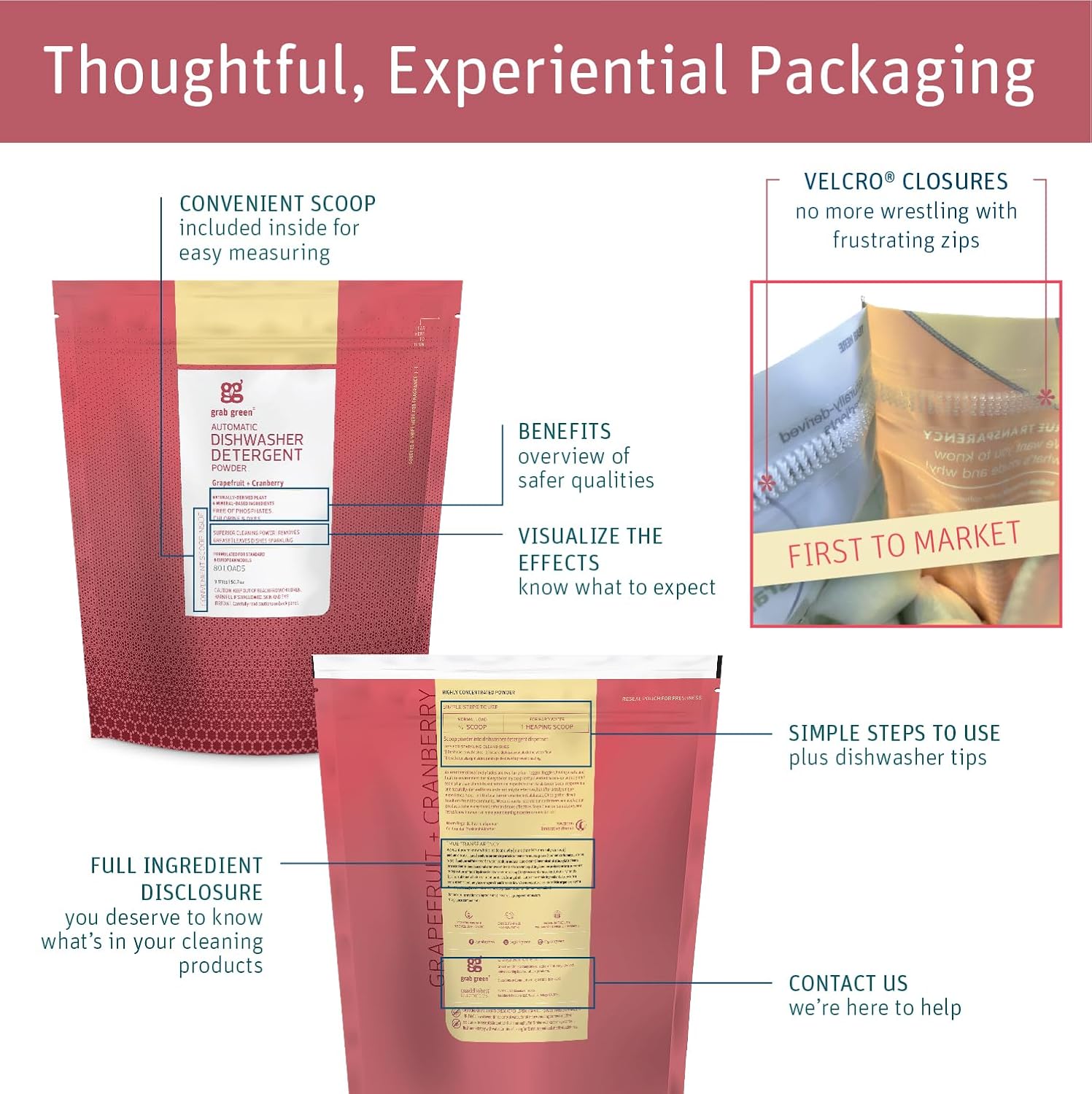 • Contains: 1- 3.17 Pound (80 Loads) Bag of Grab Green Natural Grapefruit with Cranberry Automatic Dishwashing Detergent Powder. Our velcro closure bags are convenient and easy to use, no hassling with frustrating zip closures