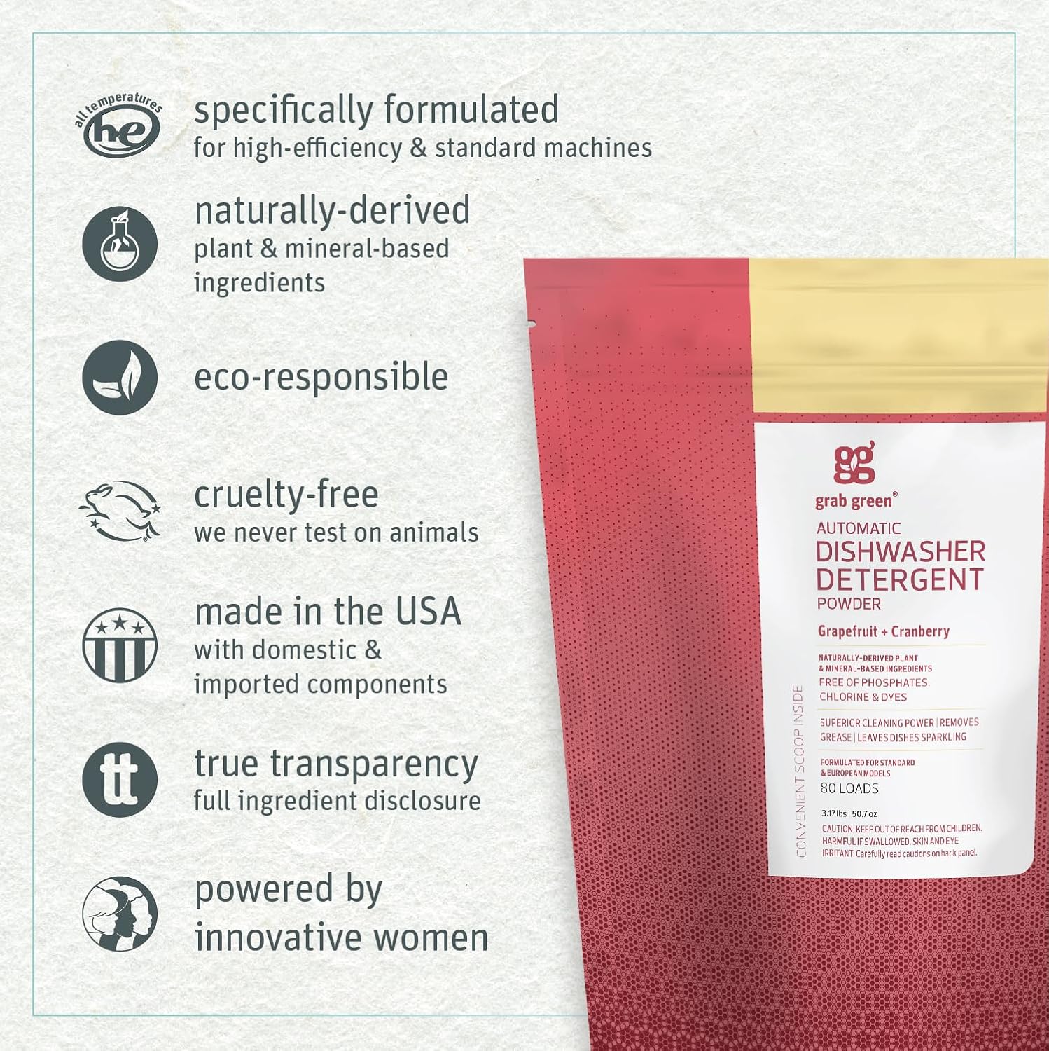 Grab Green Automatic Dishwashing Detergent Powder 3.17 lbs, 80 Loads, Grapefruit Cranberry Scent, Plant and Mineral Based, Superior Cleaning, Powerful Grease Removal, Brilliant Shine