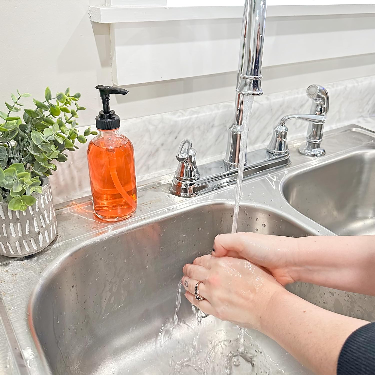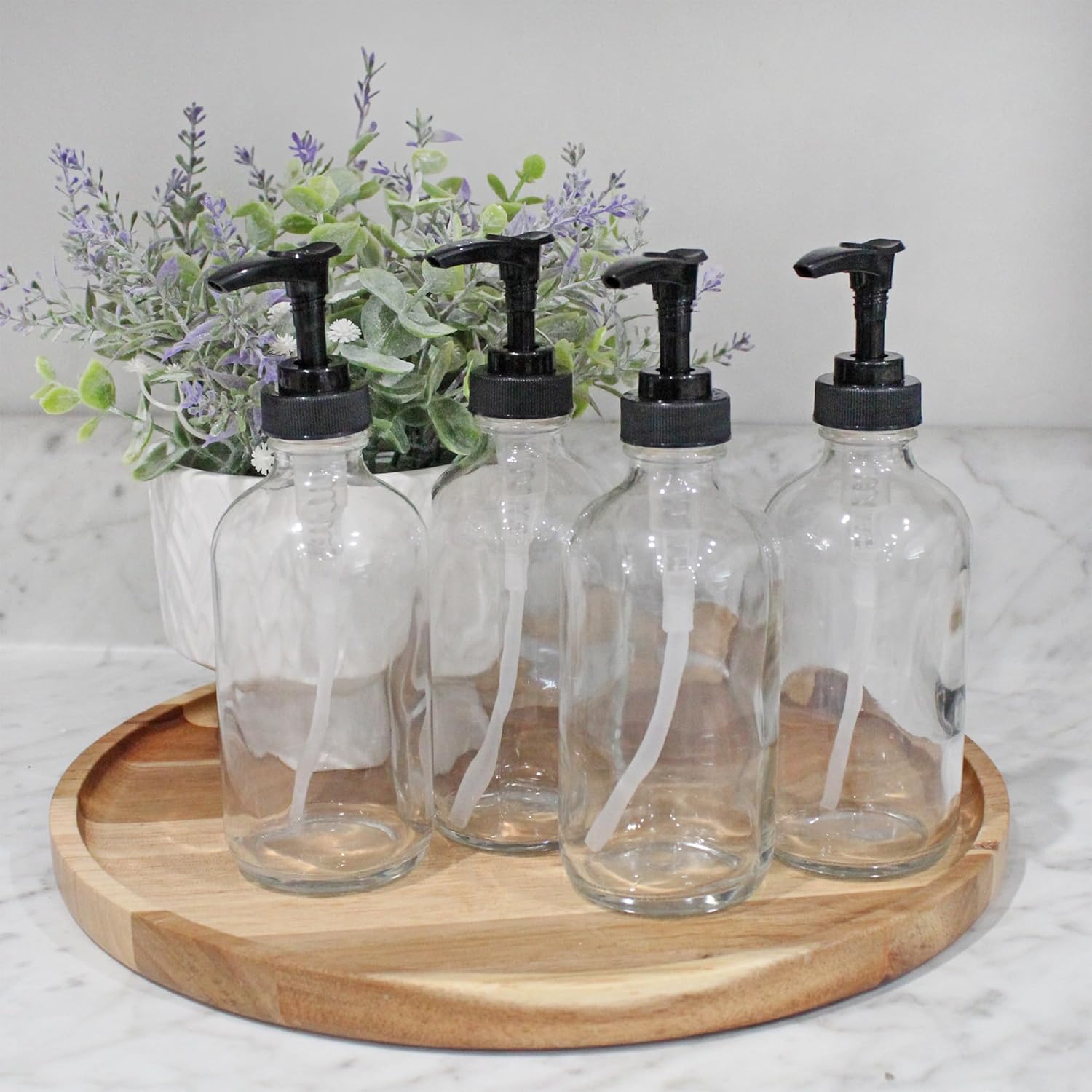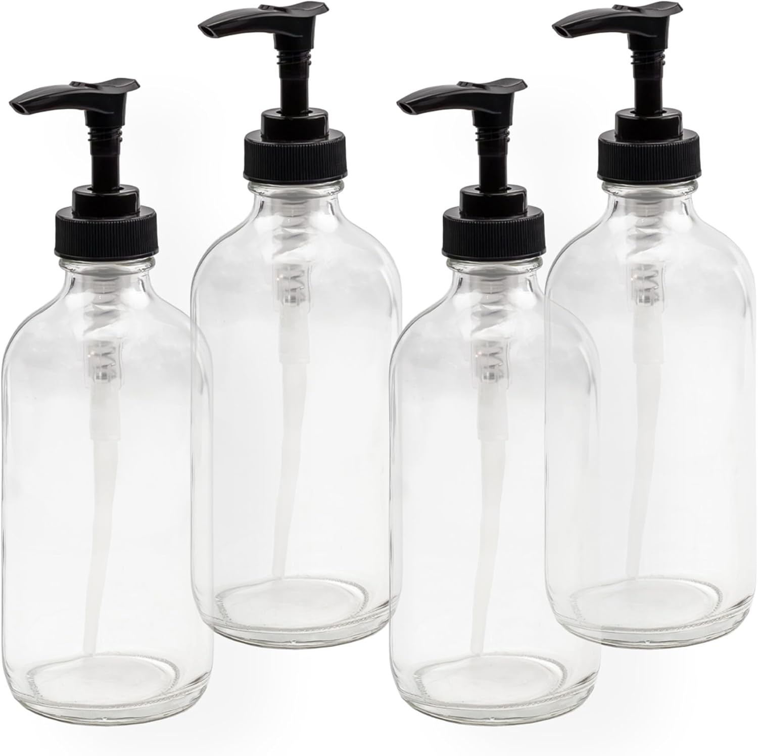Cornucopia Brands 8oz Clear Glass Pump Bottles (4-Pack w/Black Plastic Pumps), Great as Essential Oil Bottles, Lotion Bottles, Soap Dispensers, and More
