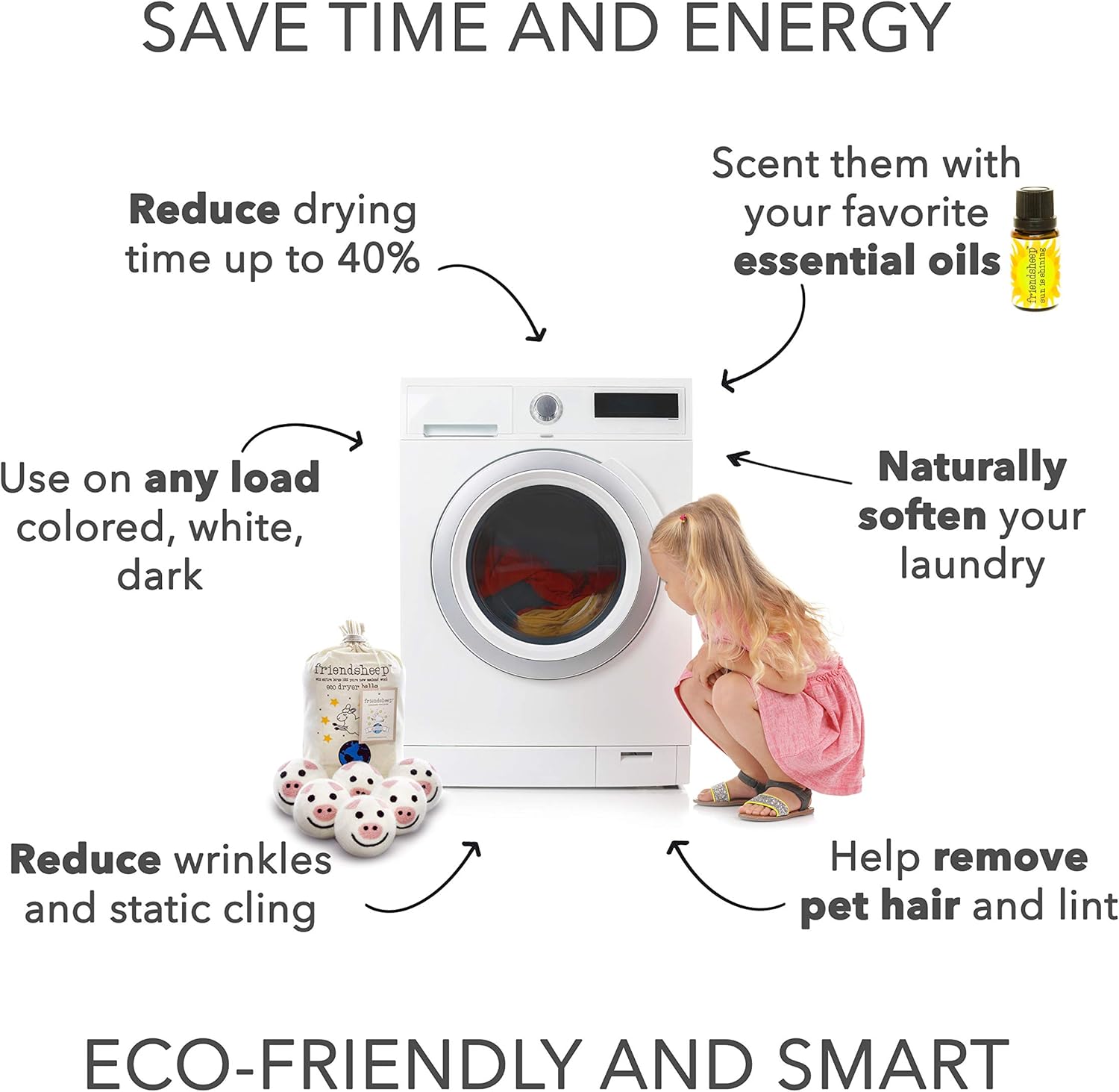 • ECO-FRIENDLY AND REUSABLE FOR 1000+ LOADS, replaces dryer sheets & liquid fabric softeners. Makes your laundry soft and fluffy, reduces wrinkles and static cling, and shortens drying time by up to 40% depending on load size. Your sheets and towels are fluffier, less balling and twisting. Makes you SAVE TIME, ENERGY, AND MONEY! All by keeping safe and healthy you, your family and the environment.