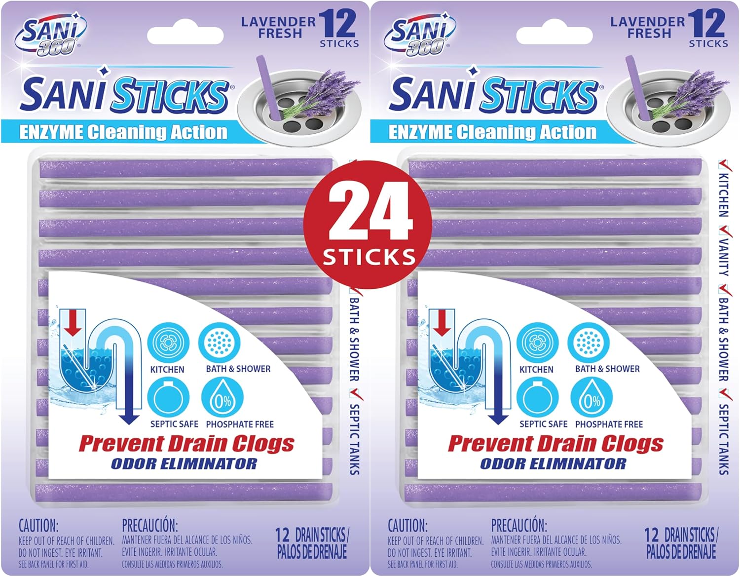 SANI 360° Sani Sticks Drain Cleaner and Deodorizer, 24 Count, Lavender Scent Enzyme Pipe Cleaners, Eliminate Odors, Prevent Clogged Drains, Safe for Sinks, Bathtub Drains, Septic Tanks