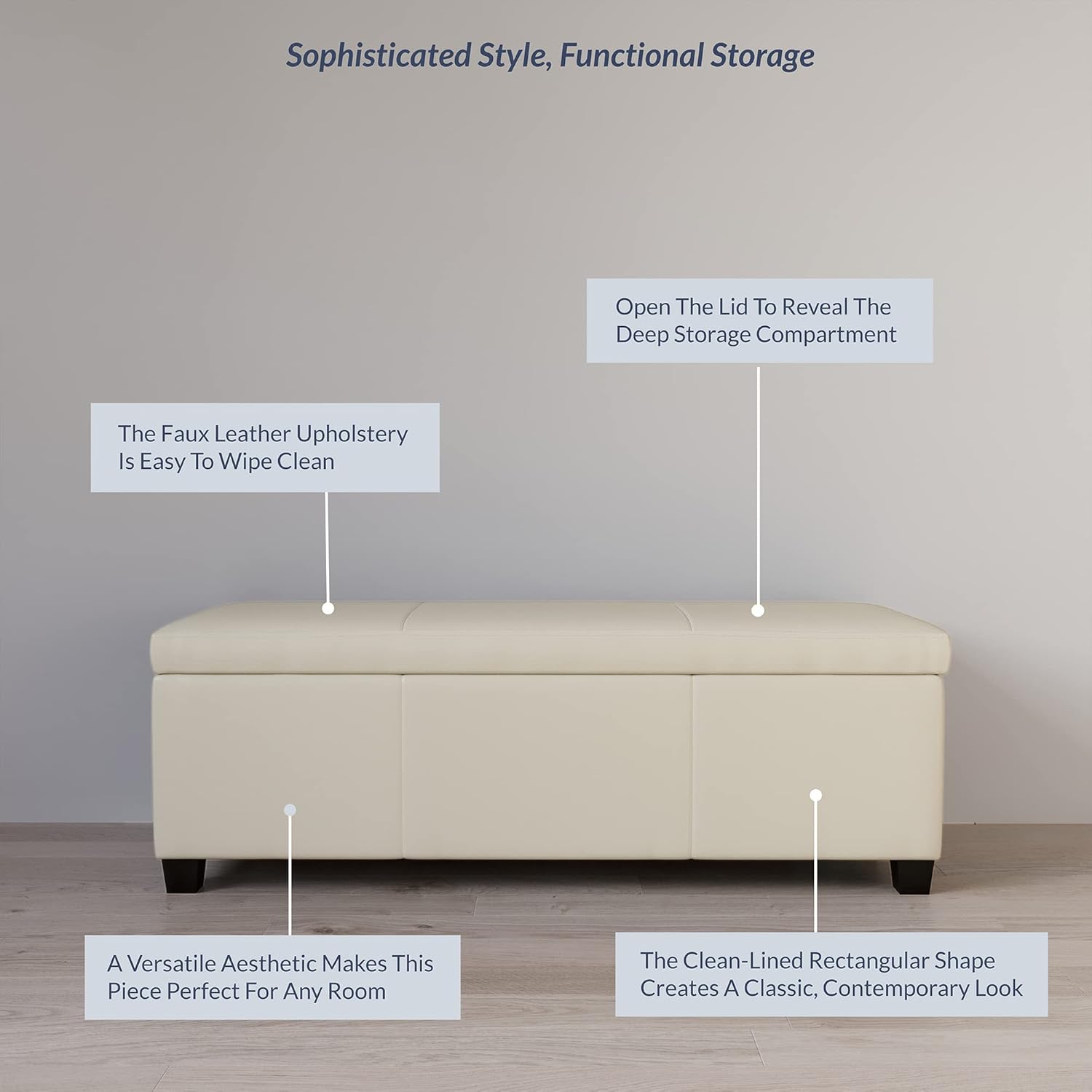 • 【MULTIFUNCTIONAL OTTOMAN With STORAGE】 Hidden storage ottoman reduces mess and solves storage problems easily, providing more space for pillows, blankets, clothes, toys and other sundries. Deep storage adds unbeatable functionality. BELLEZE faux leather ottoman is the perfect addition to any room that needs an ottoman/storage, both soft and stylish.