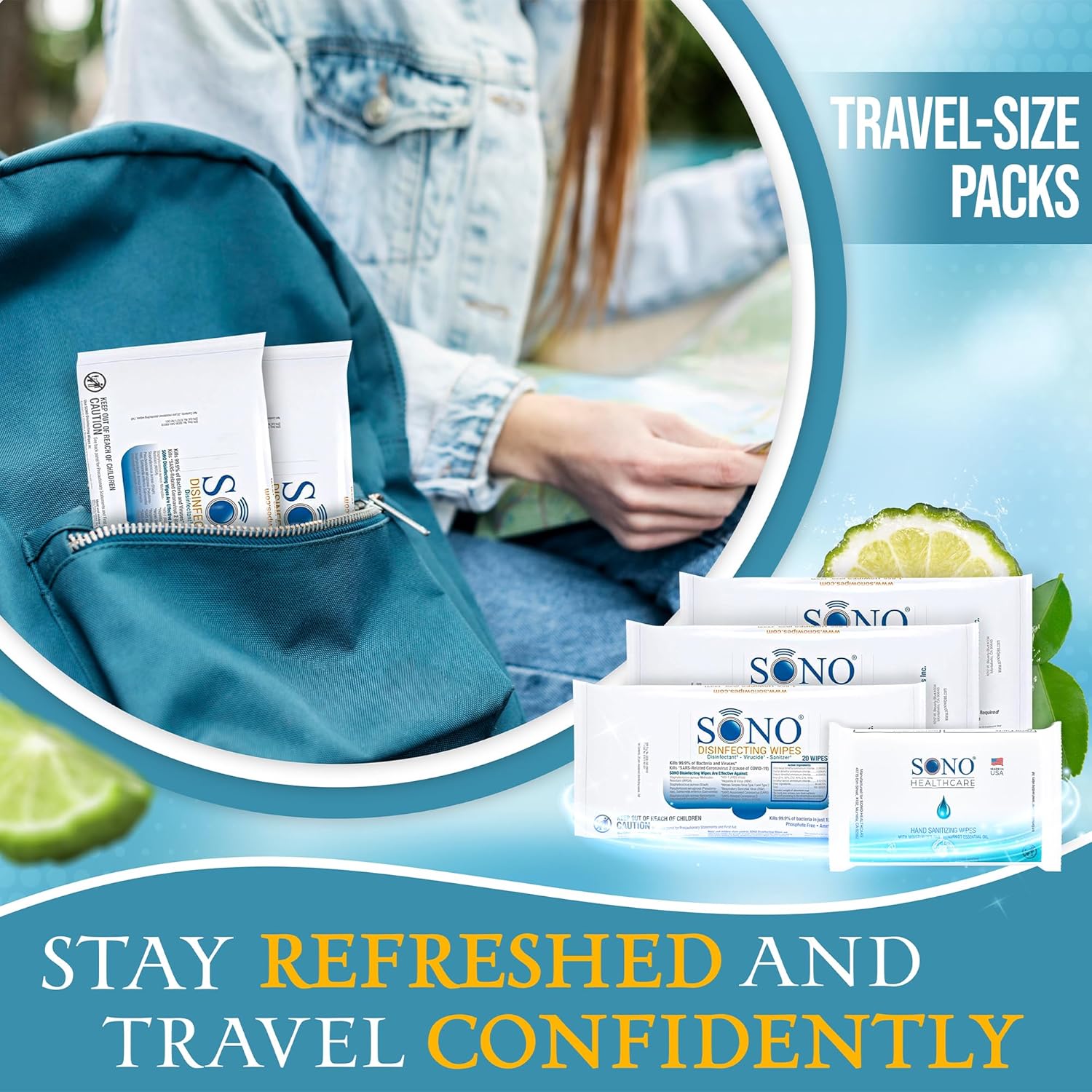 SONO Disinfecting Wipes - 60 Count (Pack of 3) + Sanitizer, Travel Size, Alcohol-Free, No Bleach, Medical-Grade, Multi-Surface Cleaning for School, Office, and On-The-Go