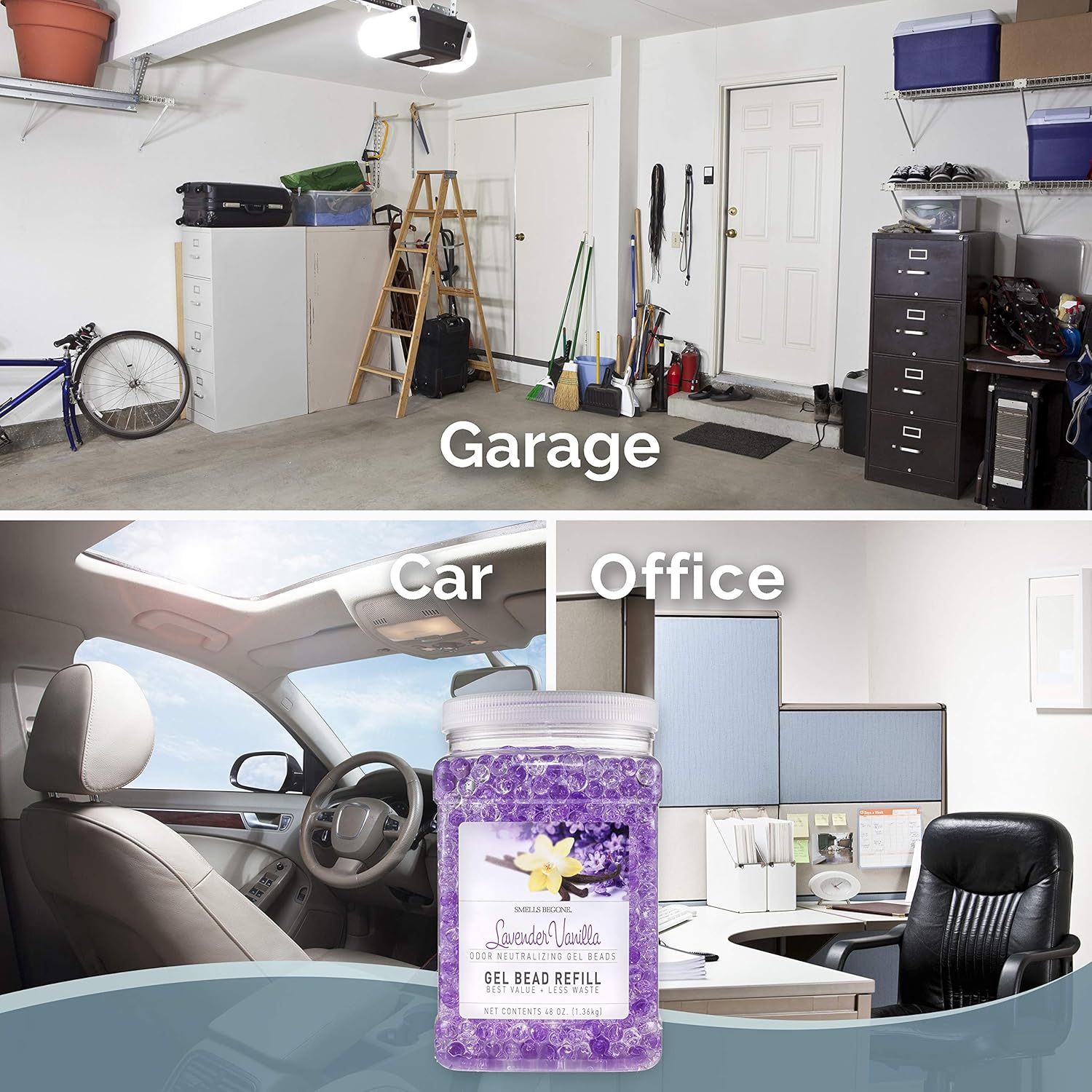 SMELLS BEGONE 48 oz Odor Eliminator Gel Bead Refill - Eliminates Odor from Bathrooms, Boats, Cars, RVs & Pet Areas - Made with Essential Oils - Lavender Vanilla Scent