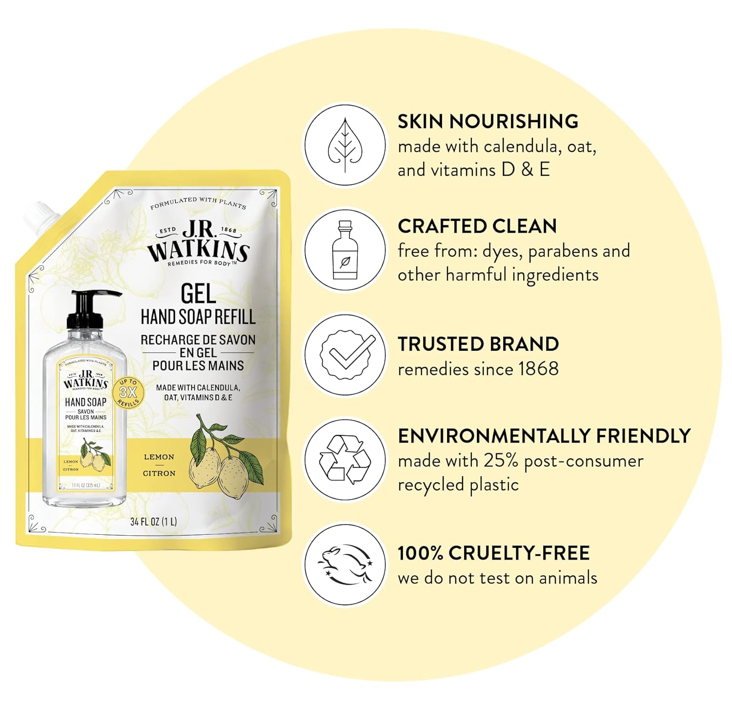 J.R. Watkins Gel Hand Soap Refill Pouch, Scented Liquid Hand Wash for Bathroom or Kitchen, USA Made and Cruelty Free, 34 fl oz, Lemon, 6 Pack