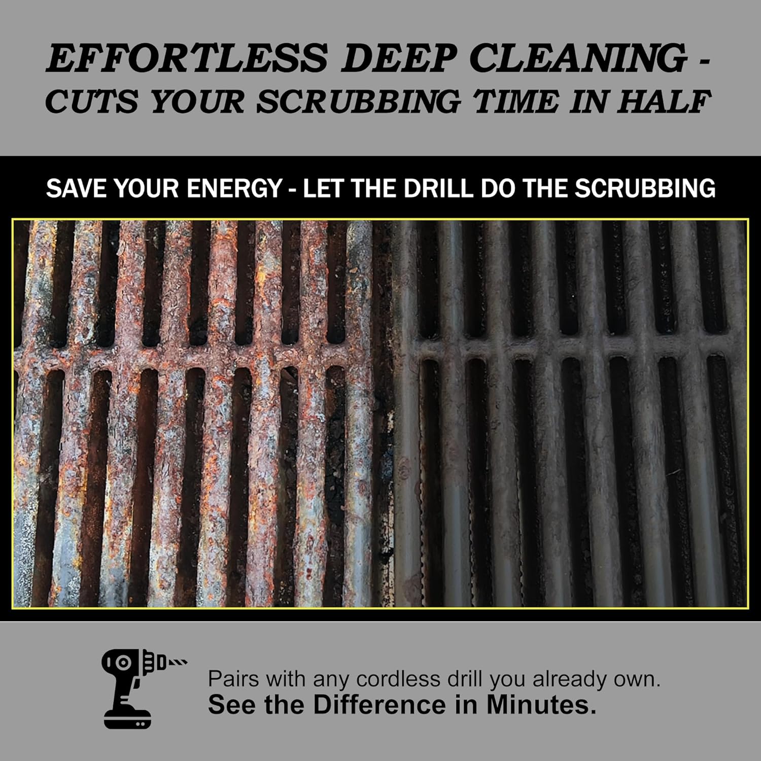 • EASY TO USE: Easily clean your gas grill, smoker, oven, or charcoal grates with this no-wire scrub brush drill attachment. Our brushes are safer than metal wire brushes—many surgeons warn against wire grill brushes due to the risk of bristles breaking off and ending up in food. These cleaning brushes for drill are tough on grime yet safe for use. The drill brush set is ideal for BBQ cleaning, rust removal, and baked-on grease with a drill scrubber brush kit.
