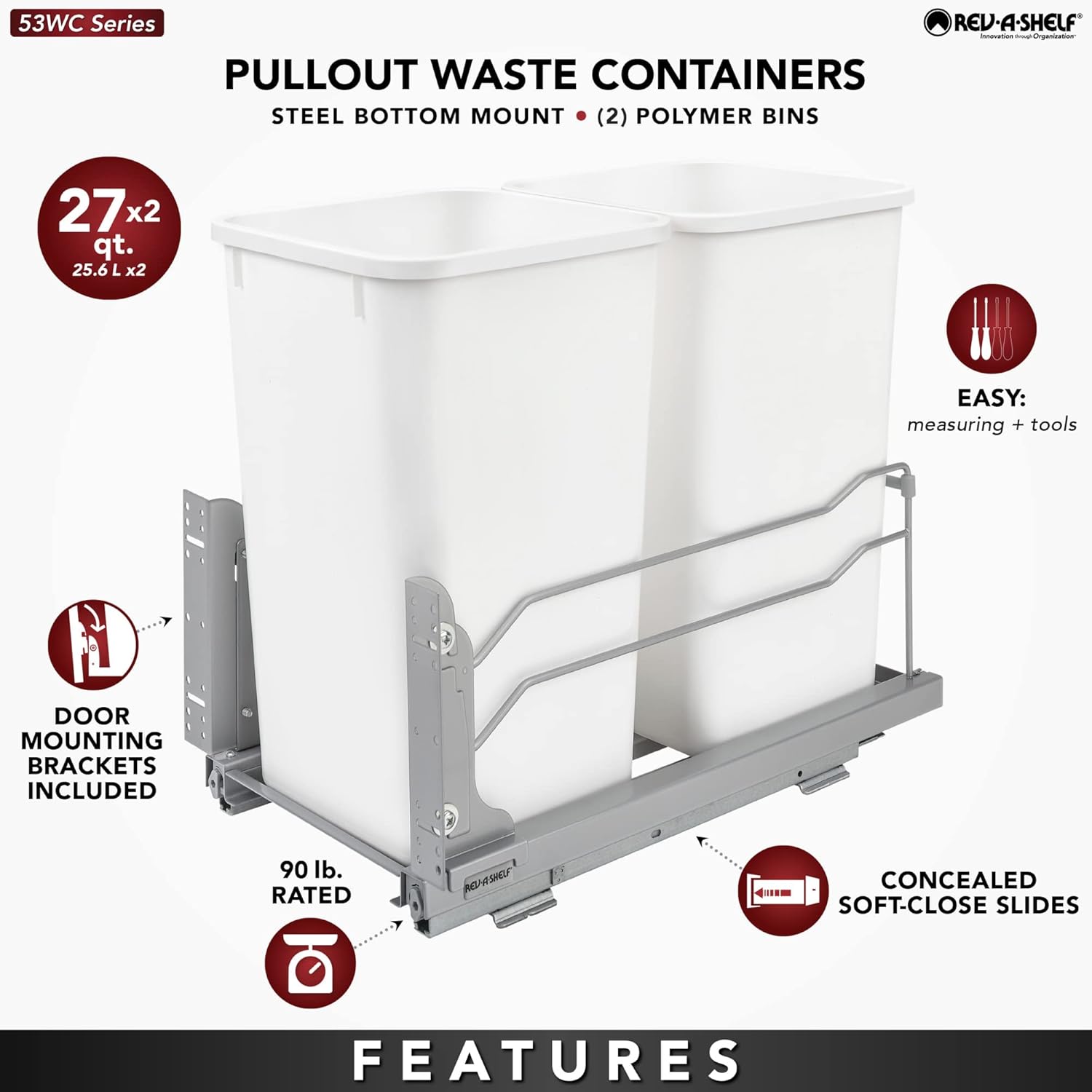 • Includes: Includes: (2) 27-quart waste containers, (1) metal frame, and (1) pair of slides; Adjustable door-mount brackets are included and required for operation; Mount the cabinet door to the unit to complete installation