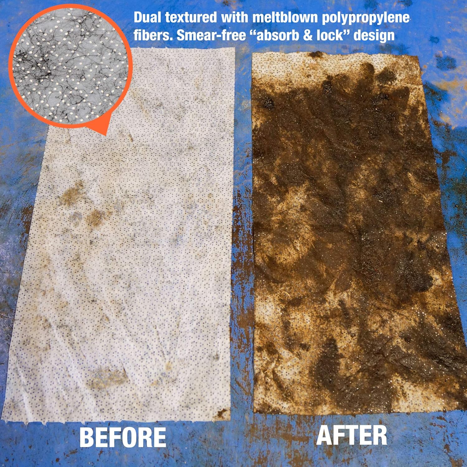 • Dual-textured wipe removes the contaminant into the wipe and away from the surface, reducing smears and speeding clean-up.