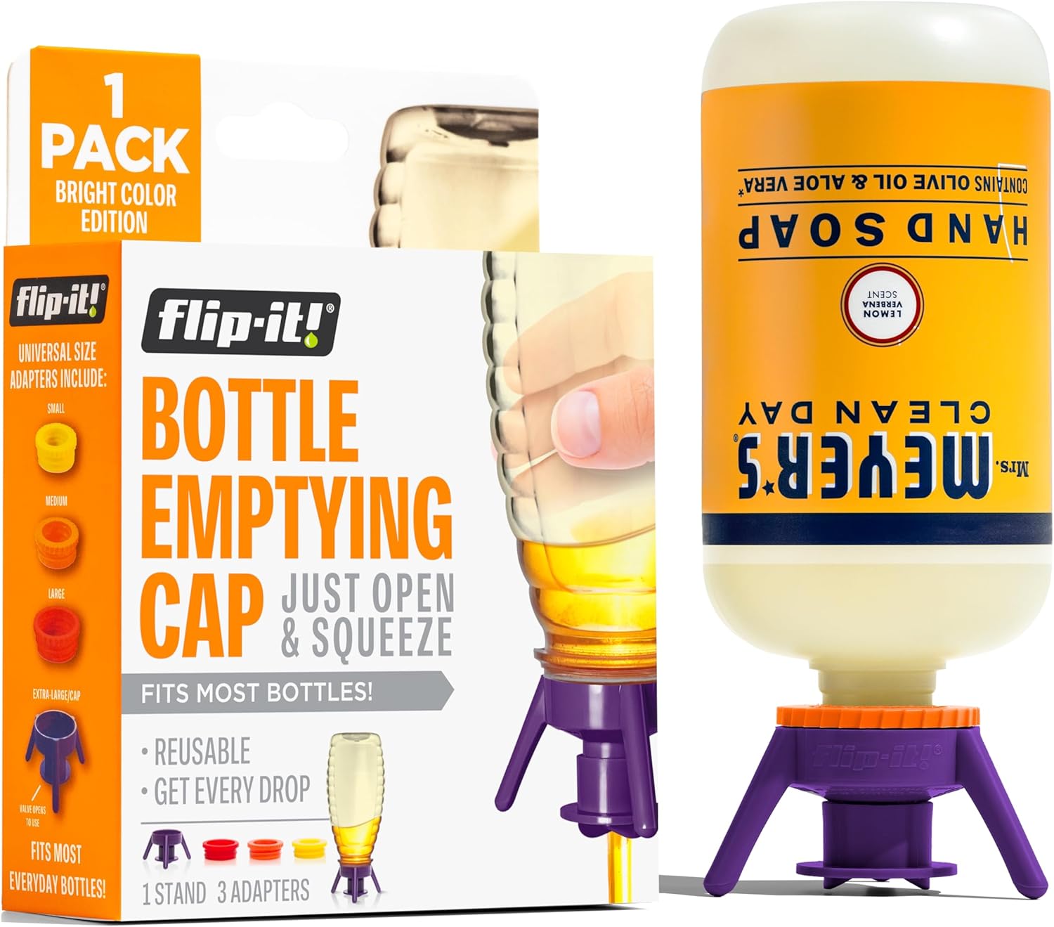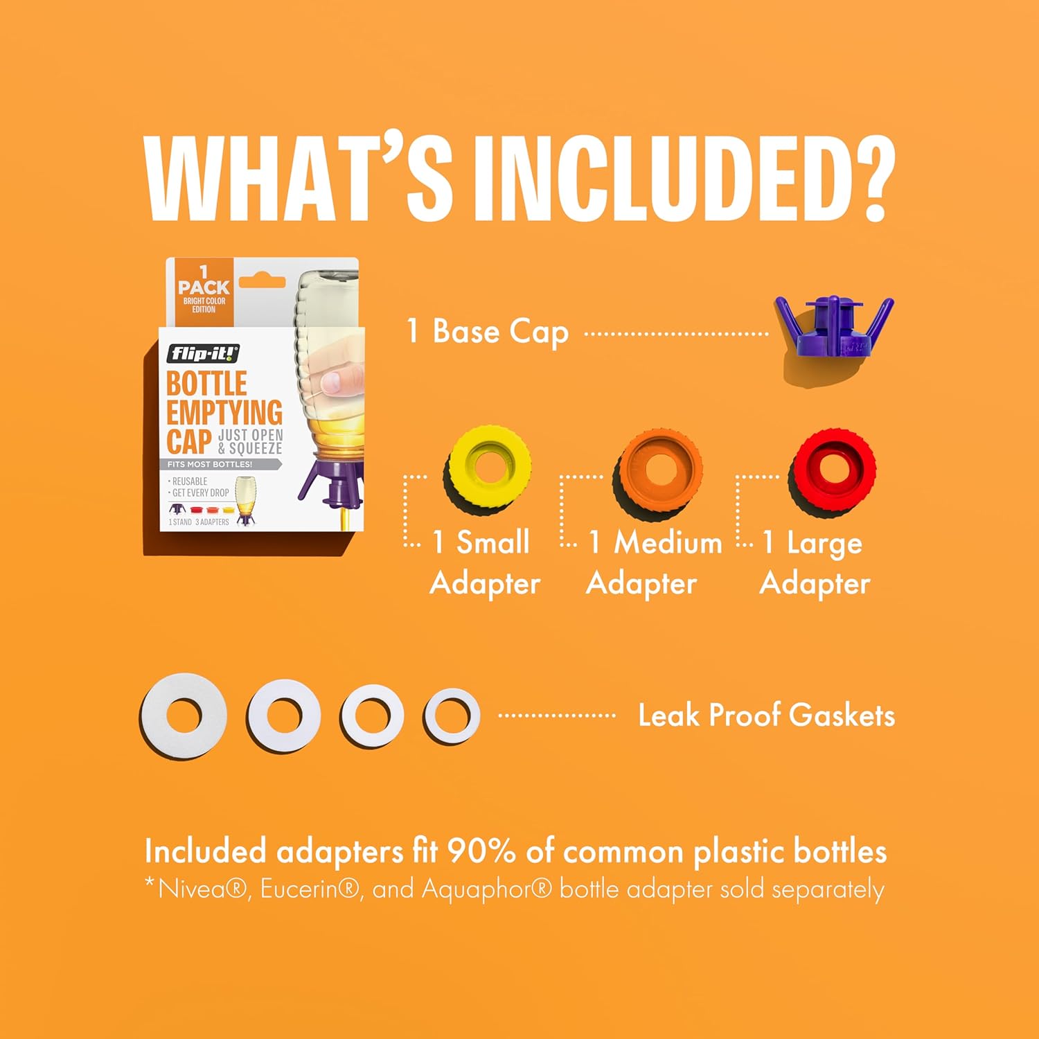Flip-It! 1-Pack Bottle Emptying Kit – No More Wasted Product - Fits Most Plastic Bottles – Get Out Every Drop of Shampoos, Lotions, & More – 1 Base Cap, 3 Adapters – Bright Color Edition