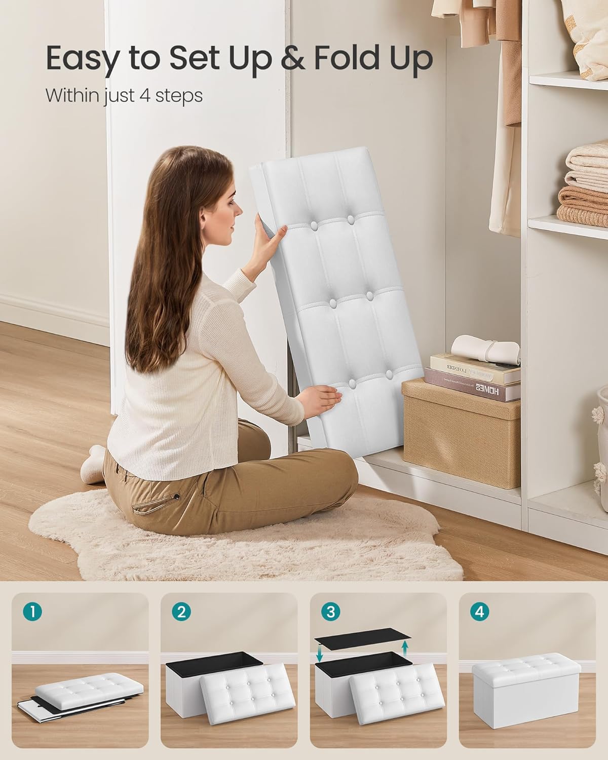 • 【QUICK ASSEMBLY, EASY FOLDAWAY】This storage ottoman from the SONGMICS MAZIE Collection has a foldable design that allows quick setup in seconds by simply inserting the bottom panel. Easily fold and store it under the bed or in a closet when not in use