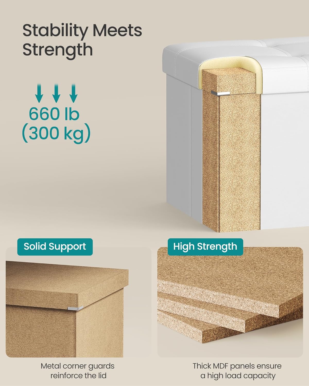 • 【GREAT STRENGTH】Built with thick MDF panels and reinforced with metal corner guards on the lid, this storage chest is strong enough to hold up to 660 lb (300 kg), so you can sit on it with your mind at ease