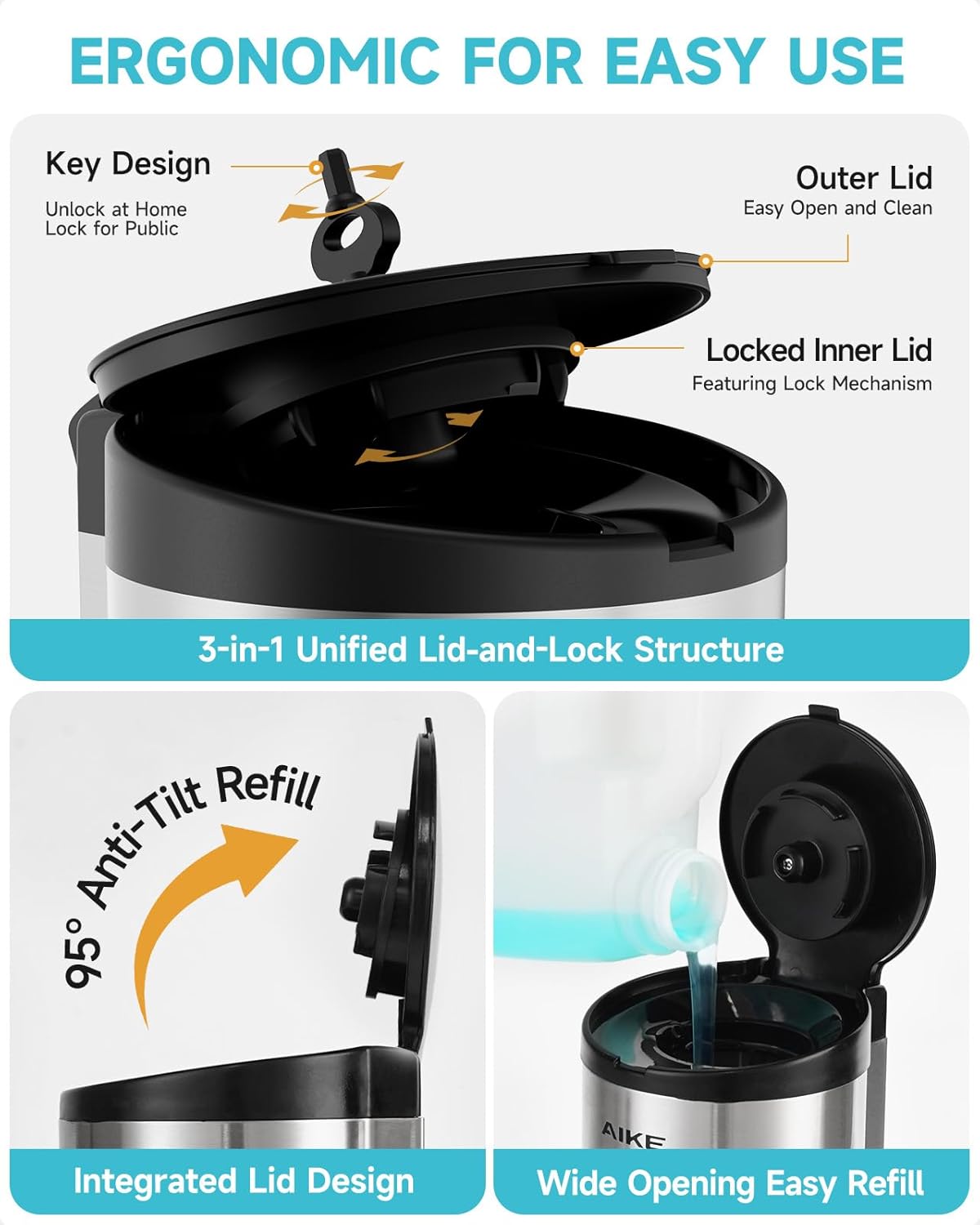 • Ergonomic design—3-in-1 integrated lid-lock mechanism for simultaneous locking. The 95-degree one-piece lid prevents liquid tipping during filling