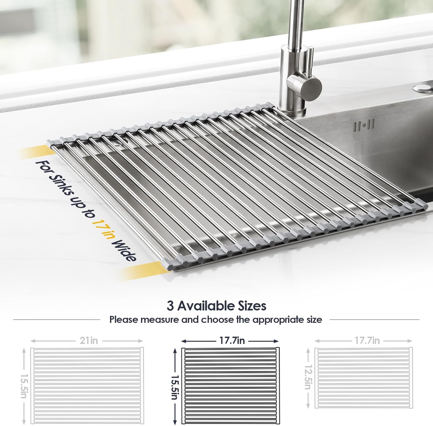 Tomorotec 17.7" x 15.5" Roll Up Dish Drying Rack Over Sink Drying Rack Sink Cover Kitchen Sink Accessories Gadget Multipurpose Organizer Foldable Stainless Steel Drainer (Grey)