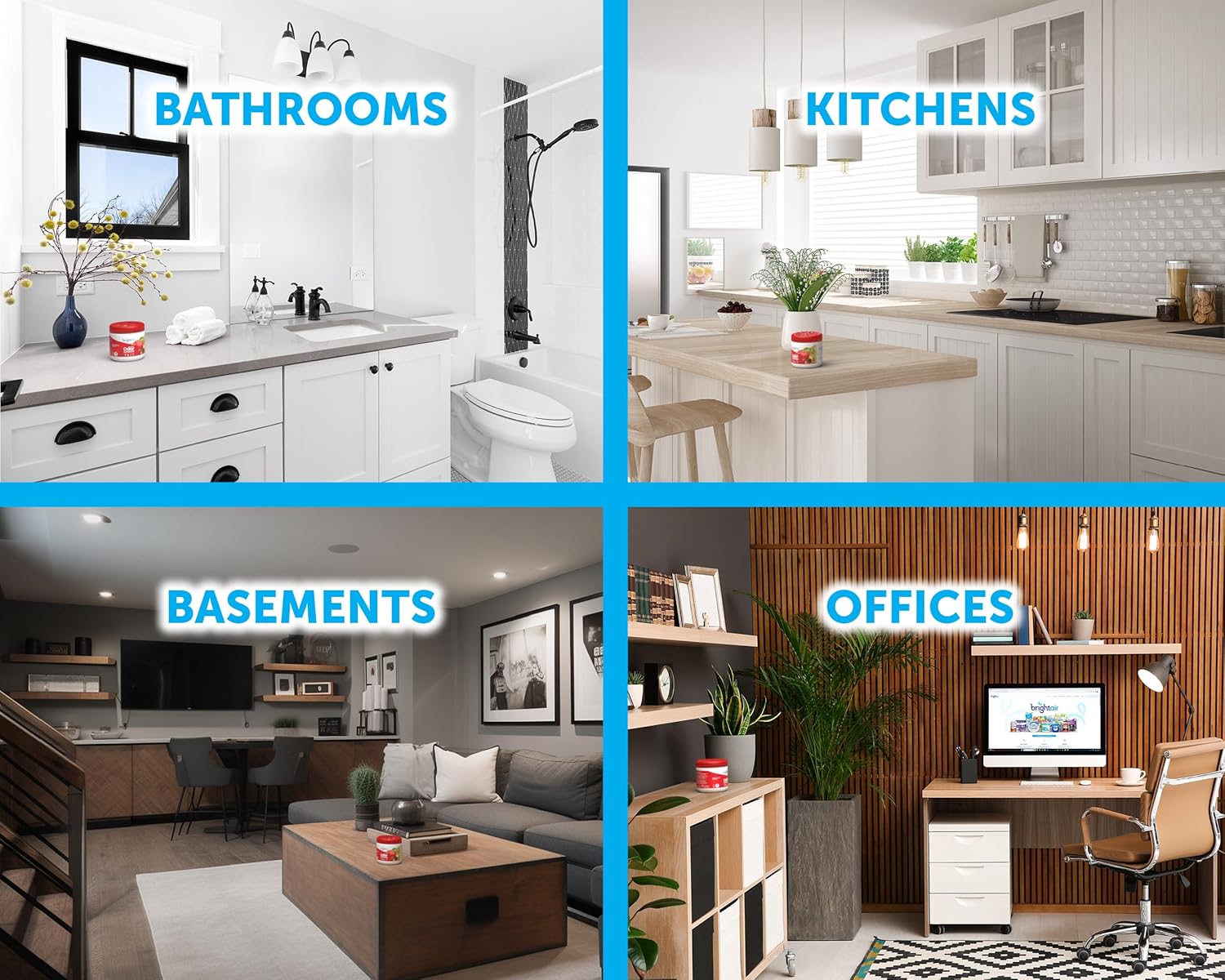 • WORKS ANYWHERE: Safe for use in medium-sized spaces (kitchens, bathrooms, basements, laundry areas, & more) around home, office, kids and pets – without batteries, plugs, refills, or sprays