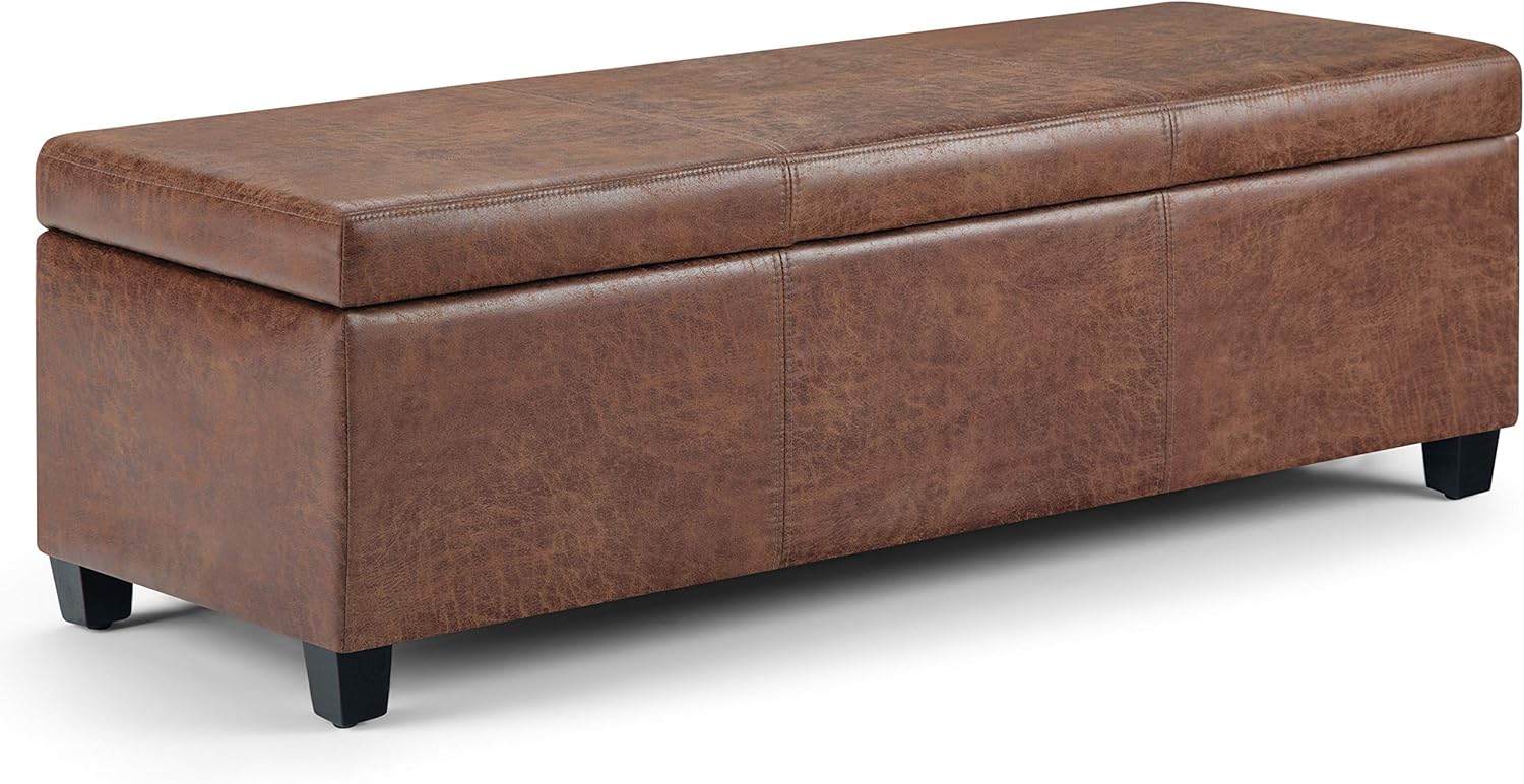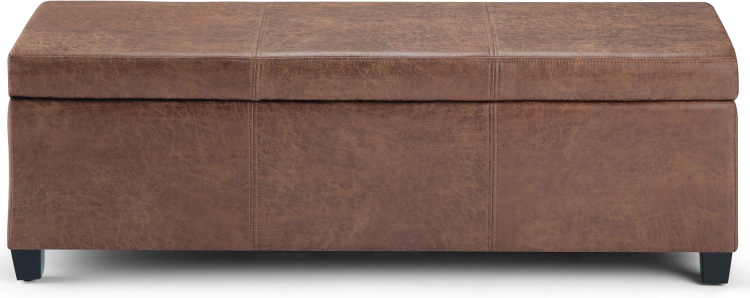 SIMPLIHOME Avalon 48 inch Wide Contemporary Rectangle Storage Ottoman Bench in Distressed Umber Brown Vegan Faux Leather, Assembled, For the Living Room, Entryway and Family Room