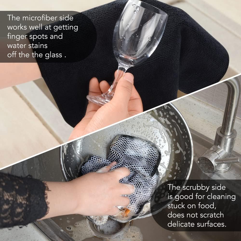 • DISH RAGS FOR KITCHEN CLEANING WITH POLY SCOUR SCRUBBING SIDE: One side is microfiber and the other side is mesh. The microfiber side works well at getting finger spots off the stainless steel appliances and the glass front of fridge or stove, microwave; the scrubby side is good for cleaning stuck on food without having to grab your scraper and does not scratch delicate surfaces either
