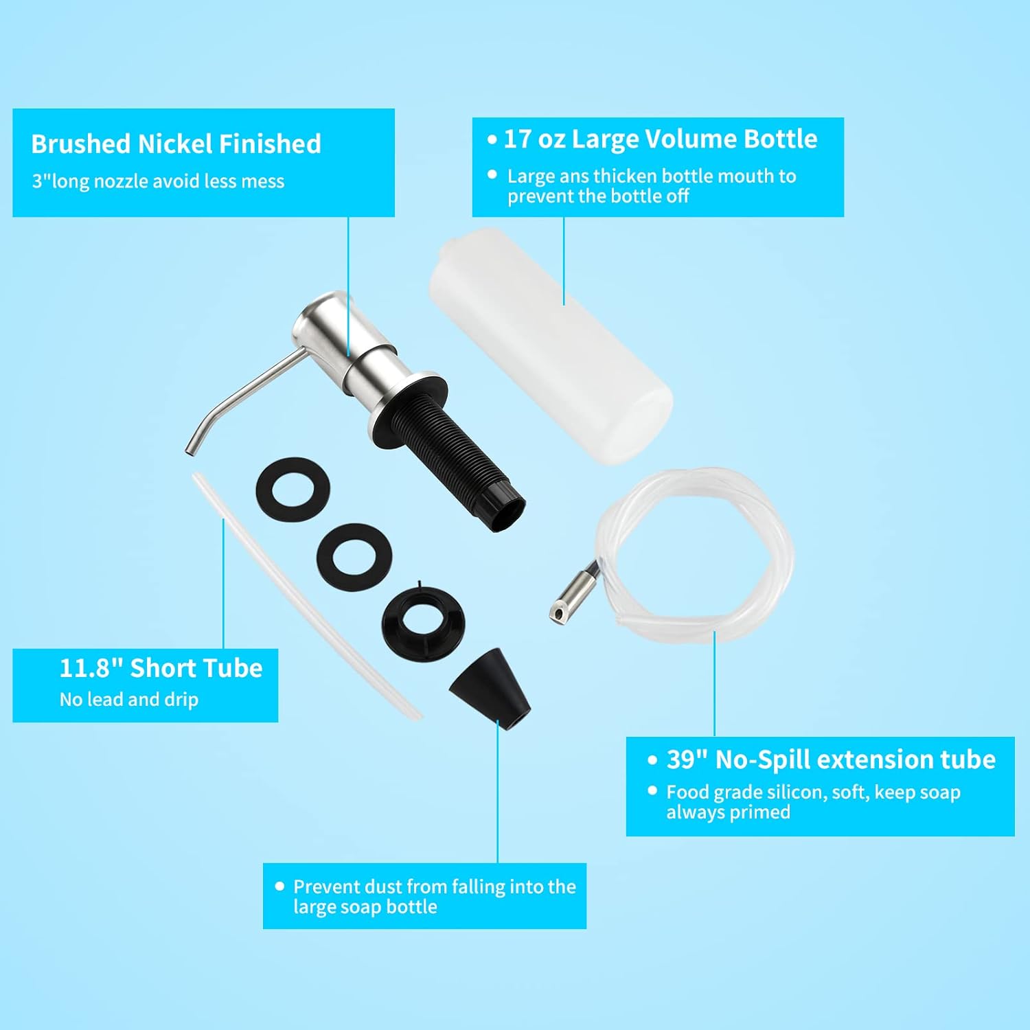 • 💧【 PREMIUM QUALITY 】 Our built in sink soap dispensers are made with 304 stainless steel pump head with durable PVC soap bottle. The 1m silicone extension tube in food grade quality is soft and elastic, brushed Nickel surface makes it resistant to corrosion and rust. Countertop soap dispenser nozzle (can swivel 360°)avoid the soap splash,the pump always stay primed.