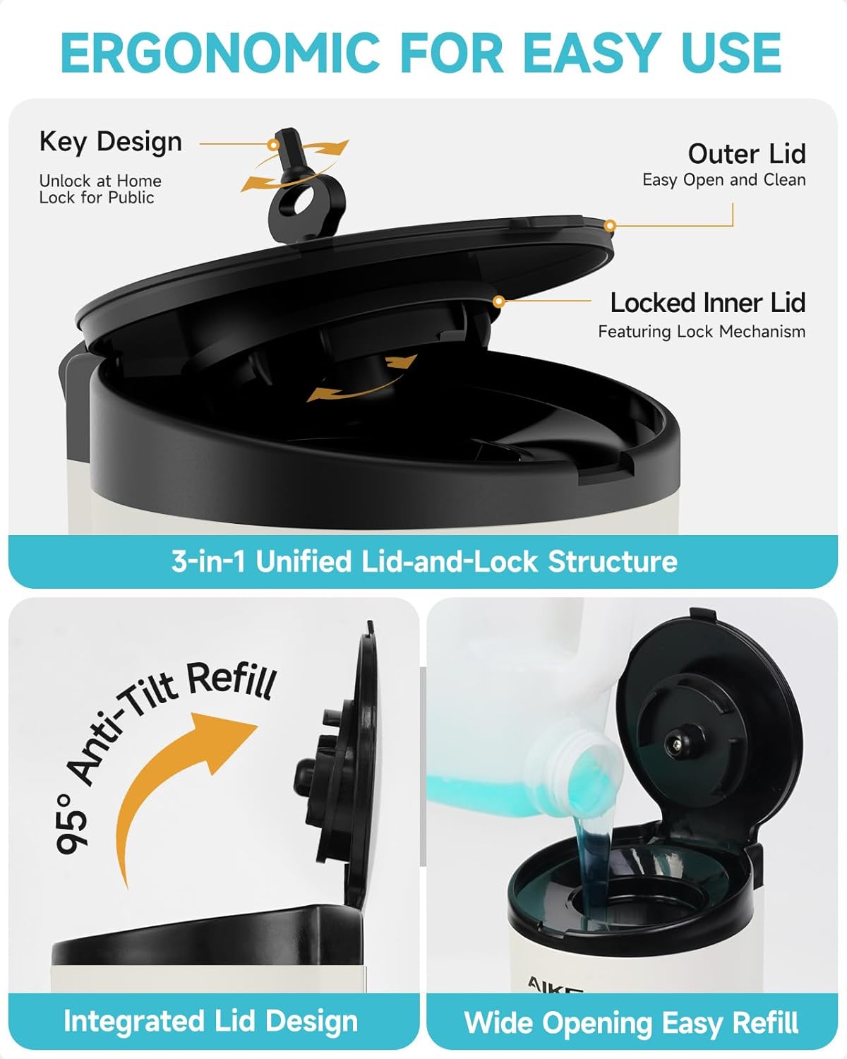 • Ergonomic design—3-in-1 integrated lid-lock mechanism for simultaneous locking. The 95-degree one-piece lid prevents liquid tipping during filling
