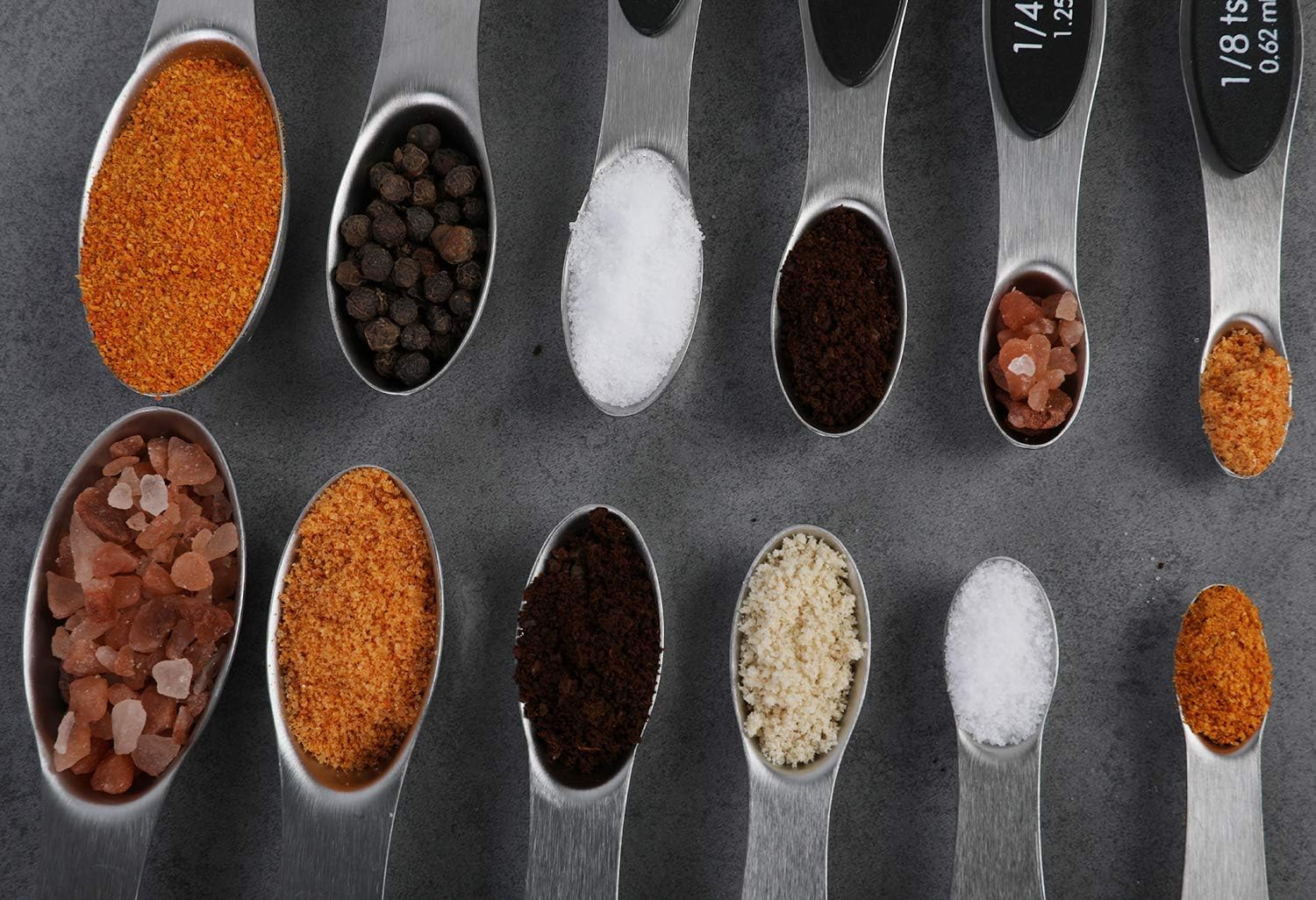 • ESSENTIAL MEASURING SPOONS for KITCHEN - These 6 individual different sized stainless steel measuring spoons(1/8-tsp, 1/4-tsp, 1/2-tsp, 1-tsp, 1/2-Tbsp. and 1-Tbsp) provide accurate measurements for your cooking and baking needs.