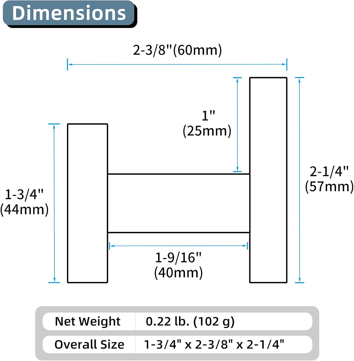 • HEAVY DUTY MOUNTING: mounting hardware is included for easy installation, handles a good amount of weight without wobbling if anchored properly. Dimensions of the hook (L*D*H): 1-3/4" x 2-3/8" x 2-1/4"