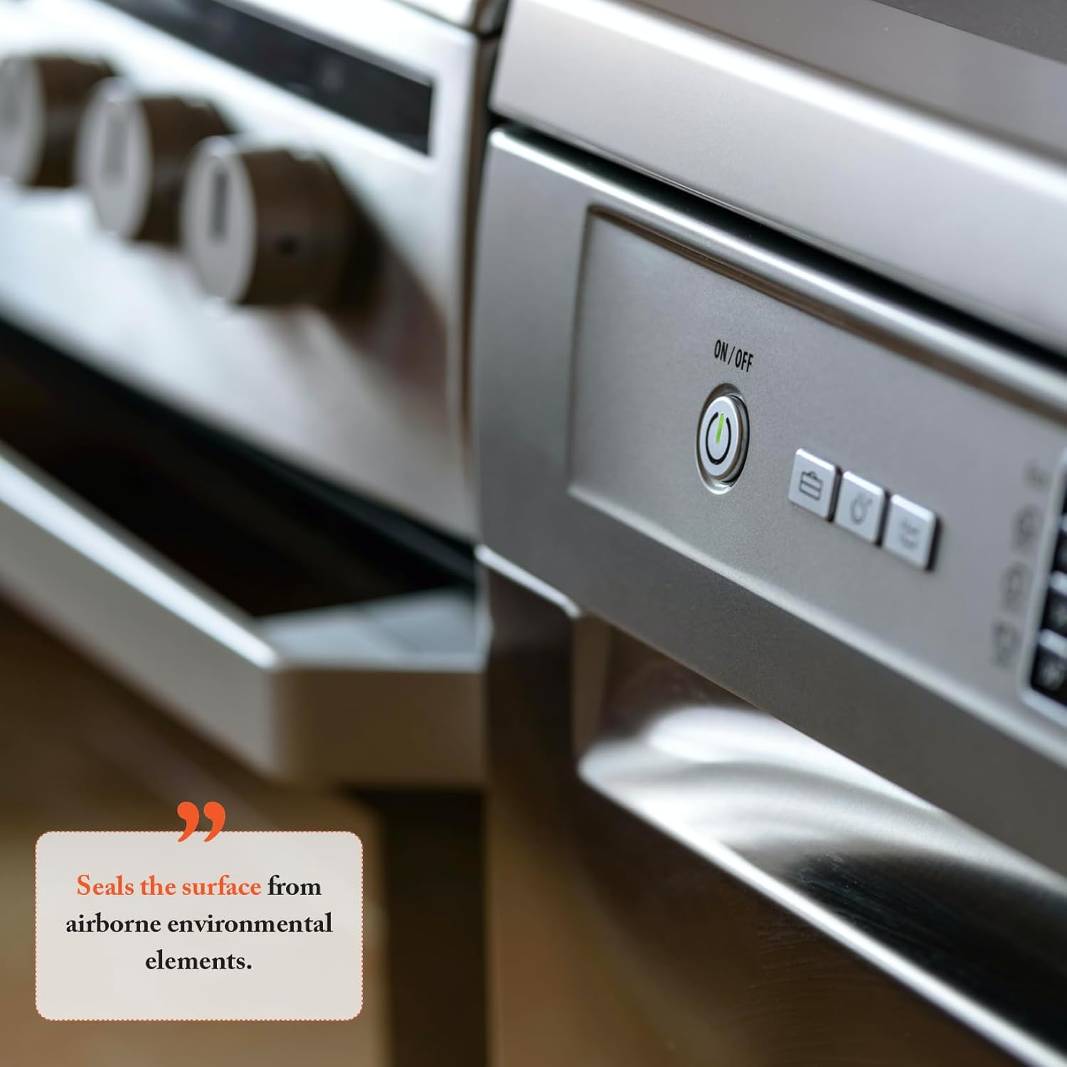 • The micro-thin oil based layer of this stainless steel refrigerator cleaner seals the surface from airborne elements, moisture, and UV light. Virtually eliminating everyday fingerprints, grease, dirt, and smudges, this stainless cleaner leaves behind a gorgeous streak free shine