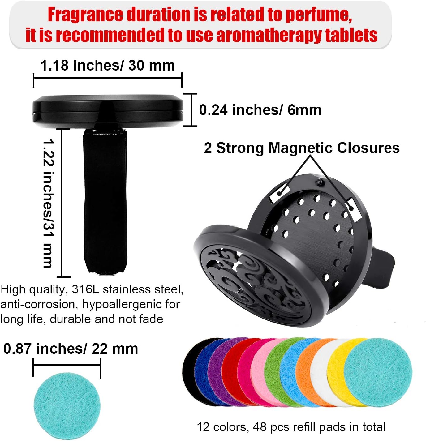 • Easy to use: add the essential oils on the replaceable felt pad and clip it to the car vent, turn on the ventilation of your car for a boost of fragrances