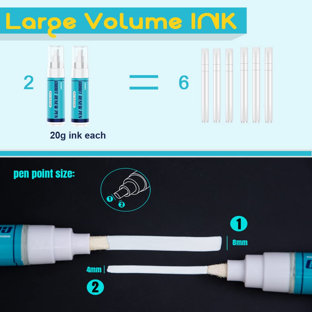 NADAMOO Grout Renew Pen White, 2 Large 20ml Paint Pens, Touch Up Repair Marker for Tile Gap Coating - Restore Grout Line, With 2 Replacement Nibs and 1 Cleaning Brush