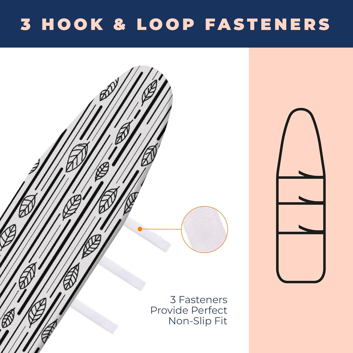 • 3 HOOK AND LOOPS, NOSE POCKET AND ELASTIC EDGES PROVIDE PERFECT NON-SLIP FIT - Elasticized edges, nose pocket and 3 hook and loops design fits the board perfectly. Slipping and the exposure of the edges will be prevented by this. Providing you to have wrinkle free clothes in a shorter time. This ironing board cover is designed for standard size boards (15x54 inches).