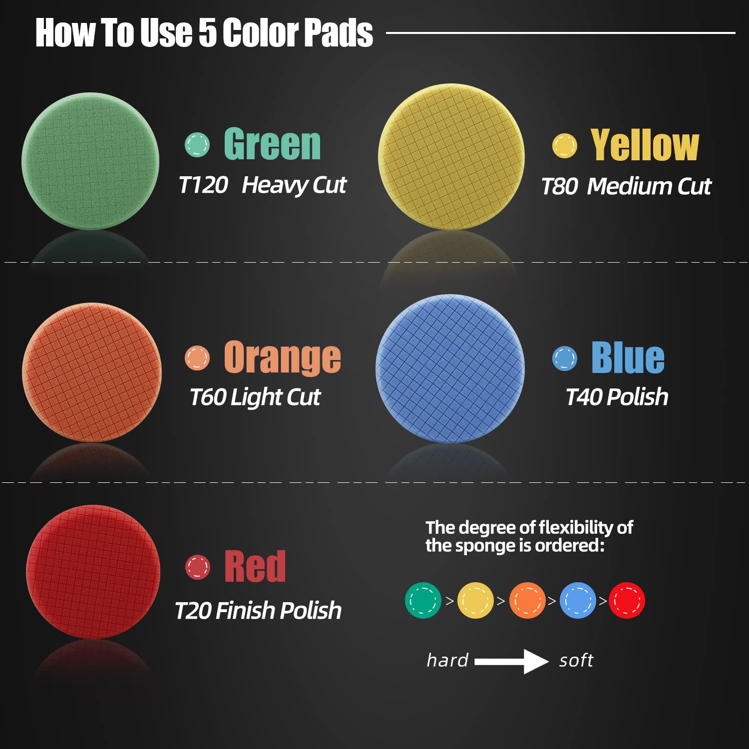 • ◆Compounding & Polishing & Waxing◆ There are five different colors of the sponge pad : Green/Yellow For Heavy Cut ,Orange For Medium Cut ,Blue For Light Cut ,Red For Finish Polish and Waxing, Great for removing sun abuse, car scratches, headlight wearing and etc. Green/Yellow Heavy Cut pad suitable for removing oxidation coating and moderate to light scratches. Orange polishing pad for removing sun abuse and swirl mask. Blue pad for polish, The red for finish polishing and waxing.
