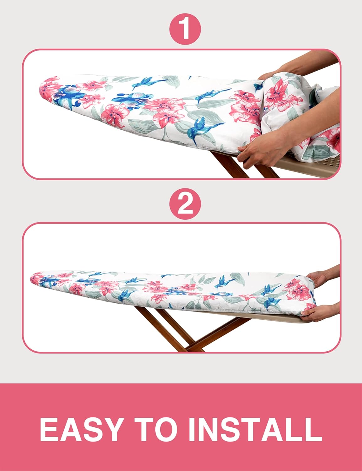 • STANDARD SIZE AND EASY TO INSTALL: Durable and stretchable material makes board cover fit standard size, and even 15" x 54" ironing boards. Cozy nose pocket helps installing easier, and fixing on the boards better