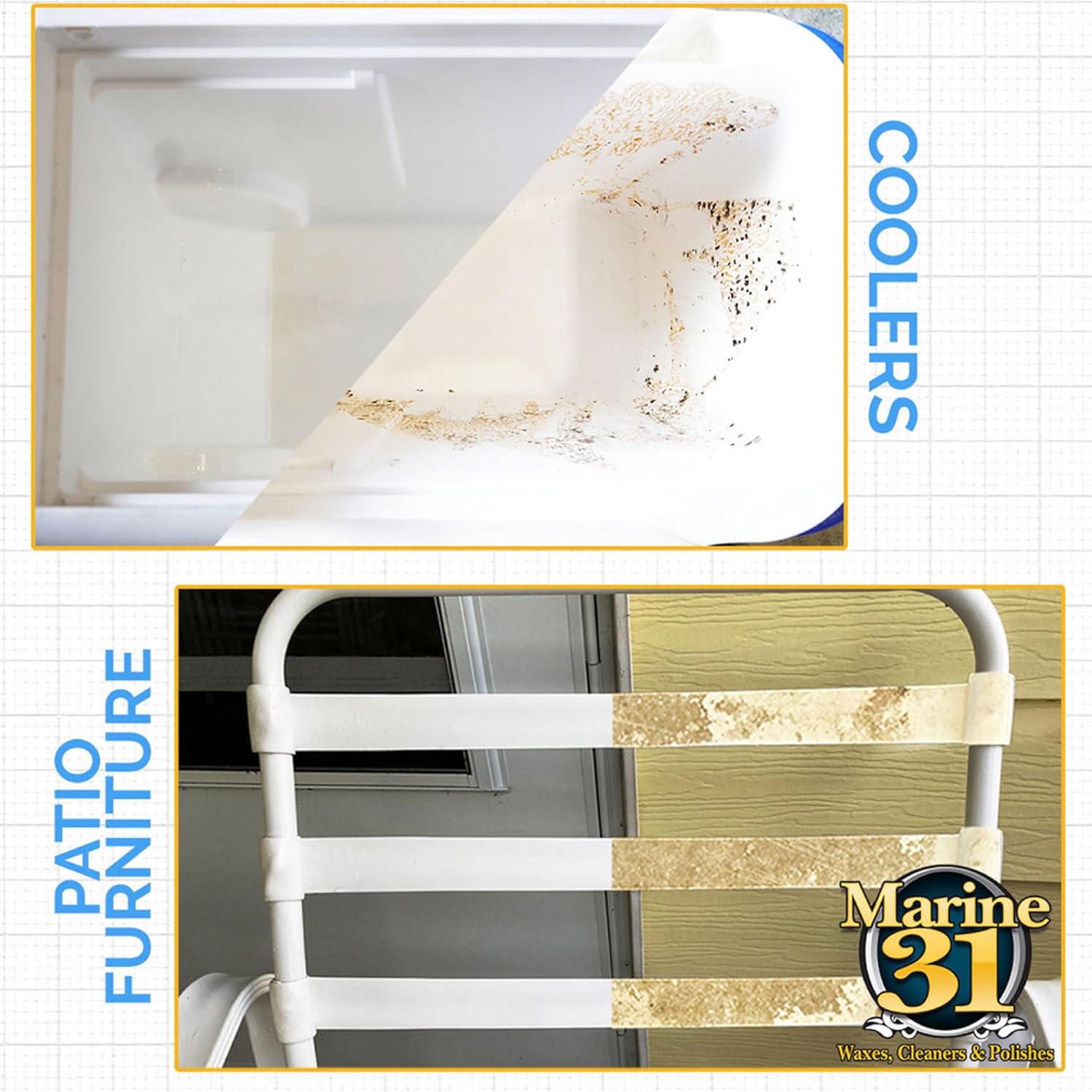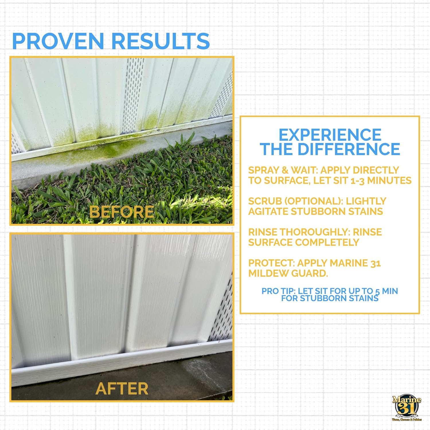• MULTIPLE USES: Safe for Boats, Vinyl, Tile, Grout, Patio, Coolers, and just about anywhere else that may accumulate stains. Marine 31 Mildew Stain Remover works like no other!