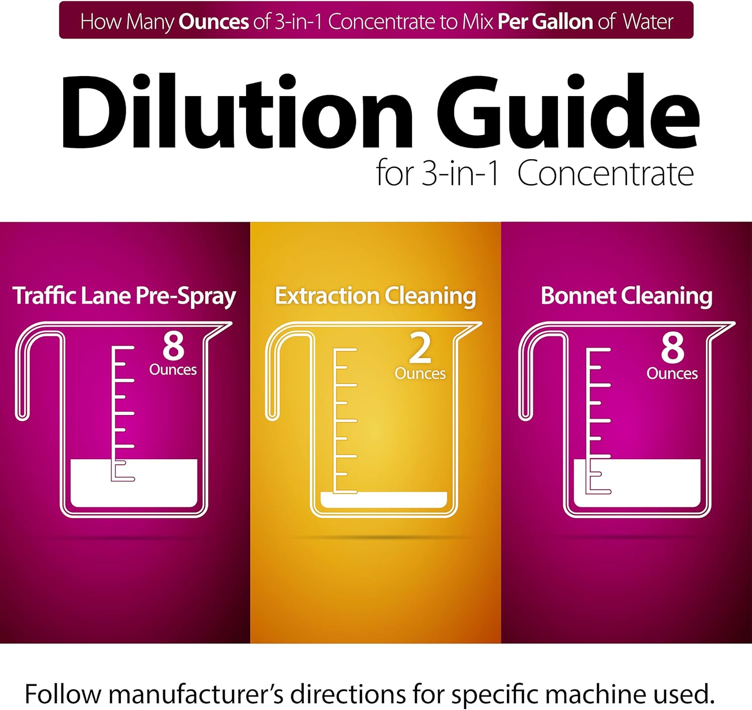 • Multi-Purpose Solution: Our 3-in-1 Carpet Cleaner Concentrate is a concentrated carpet cleaner specifically formulated to be 3 products in 1: a traffic lane prespray, a spot cleaner, and an extraction cleaner.