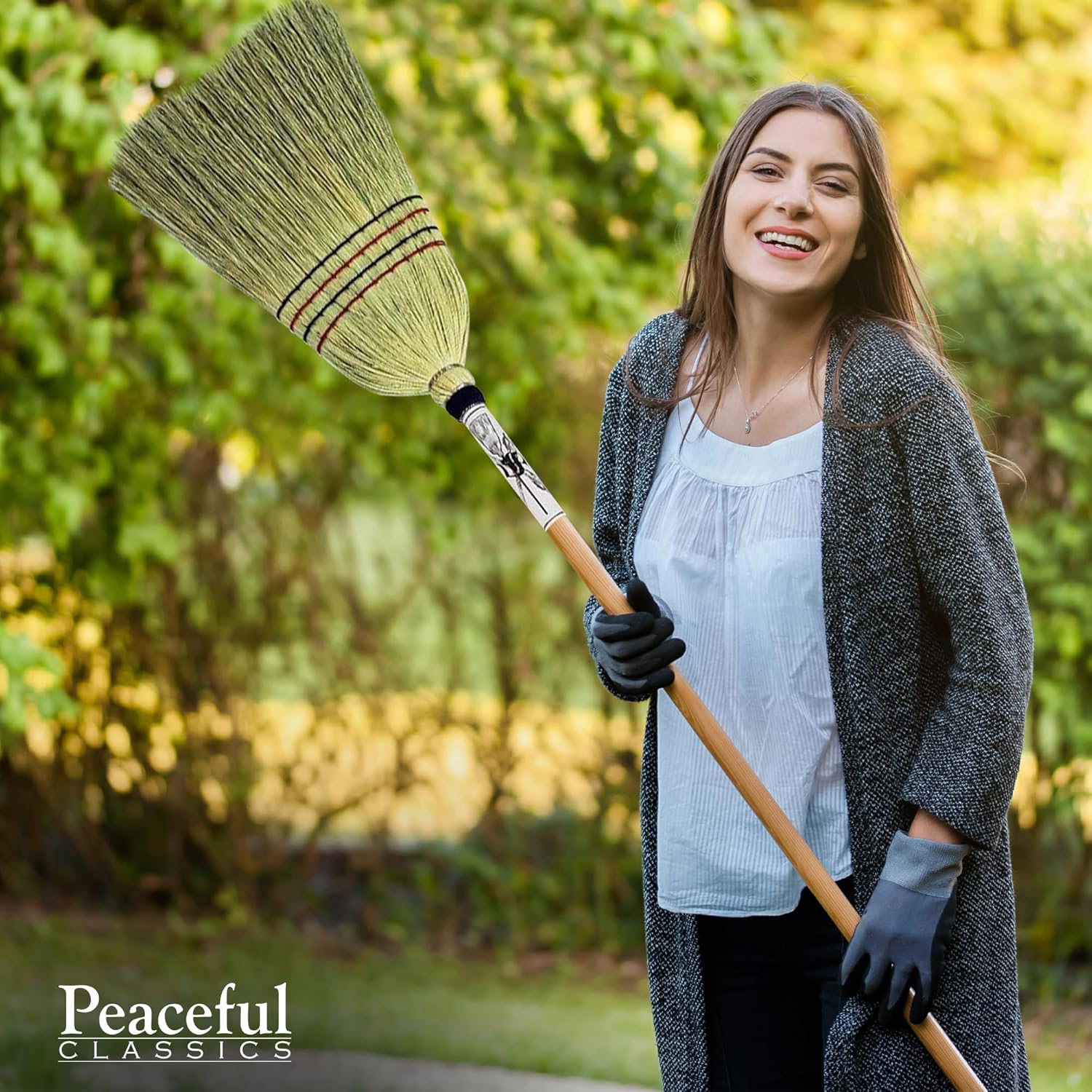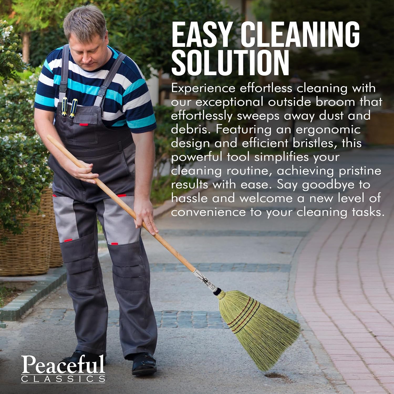 • GREAT SIZE: Peaceful Classics indoor and outdoor broom is sized perfectly with dimensions of 57” long, along with a broom head 19" long and 12" inches wide. The wood broom handle is 1 ¼” thick. Use the wooden broom stick with ease and take the hassle and frustration out of cleaning!