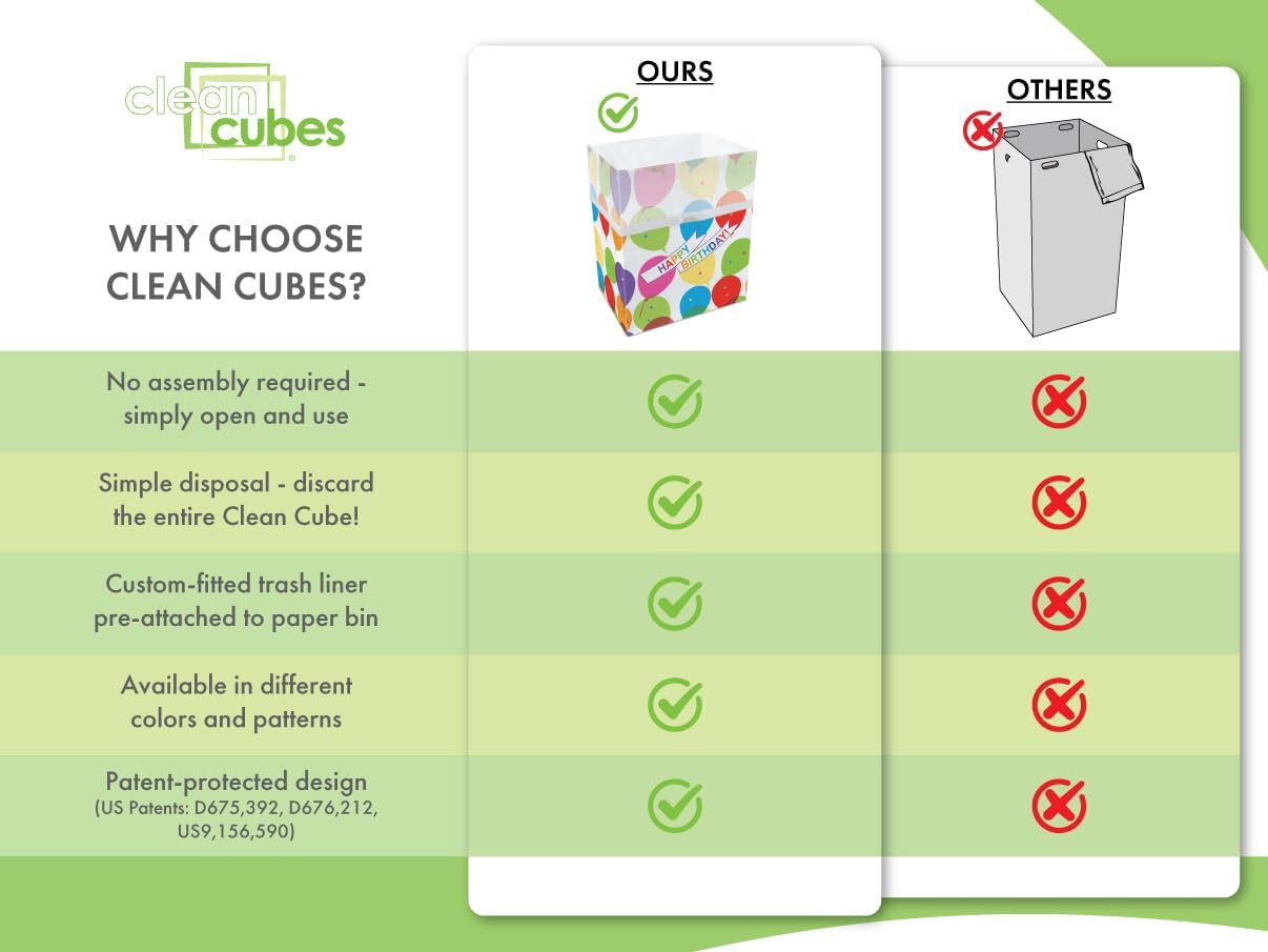 • ✅【EFFORTLESS CLEANUP & DISPOSAL】Simply unfold, use, and toss — keep your event clean and mess-free without extra effort. Clean Cubes are disposable recycling bins and trash cans with a patent-protected design and custom-fitted trash liner in each bin.