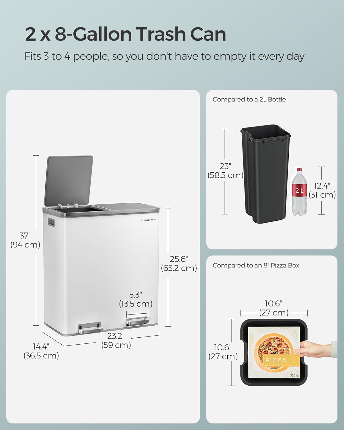 SONGMICS Trash Can, 2 x 8 Gallon (2 x 30 L) Garbage Can for Kitchen, with 15 Trash Bags, 2 Compartments, Plastic Inner Buckets and Hinged Lids, Airtight, White and Gray ULTB60WT