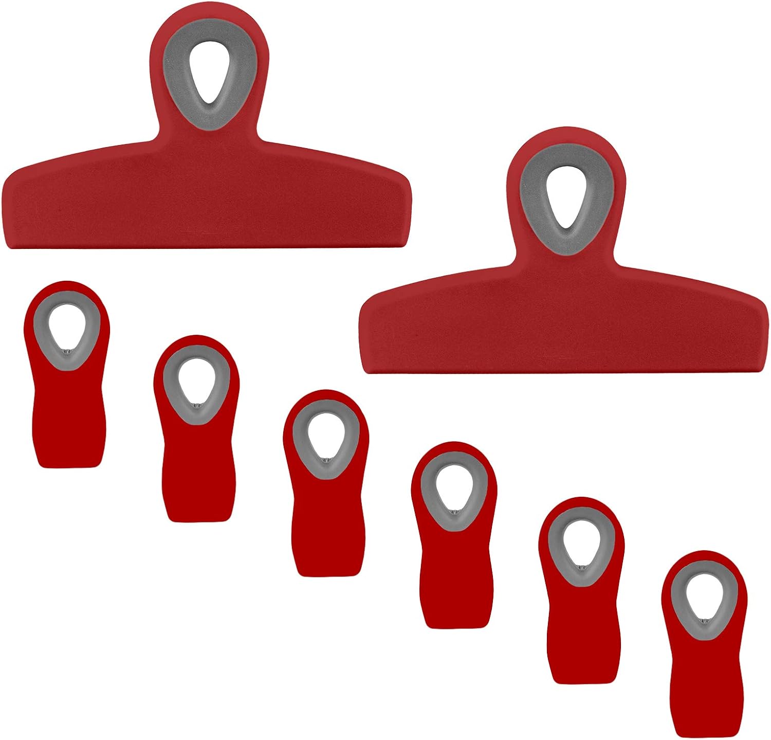• Set includes 2 large 5" soft touch bag clips, the great size clip for extra big bags of chips and food and 6 soft touch nylon clips with magnets on the back, great for sealing smaller bags of chips and food.