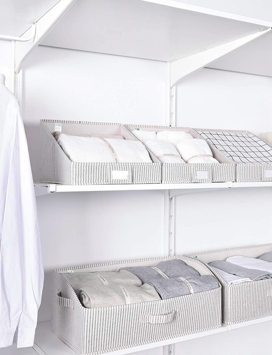 StorageWorks Closet Storage Bins, Trapezoid Organizer Box for Shelves, Fabric Clothes Bin, Foldable Organizing Baskets with Handles, Large, Khaki and Beige Stripes, 3-Pack