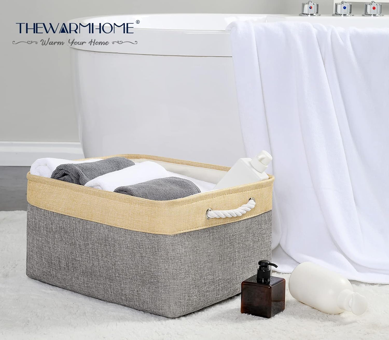 • 【ARTISTIC】: TheWarmHome Fabric Bins had great storage capacity and stylish. Minimalist design and neutral color exterior fabric can be integrated into any home decorations and styles. White cotton rope handles on the sides add a nature touch. The storage basket is like an art, not only provide a solution to many storage needs make home keep clean and tidy, doubles as a charming decoration. TheWarmHome, WARM YOUR HOME.