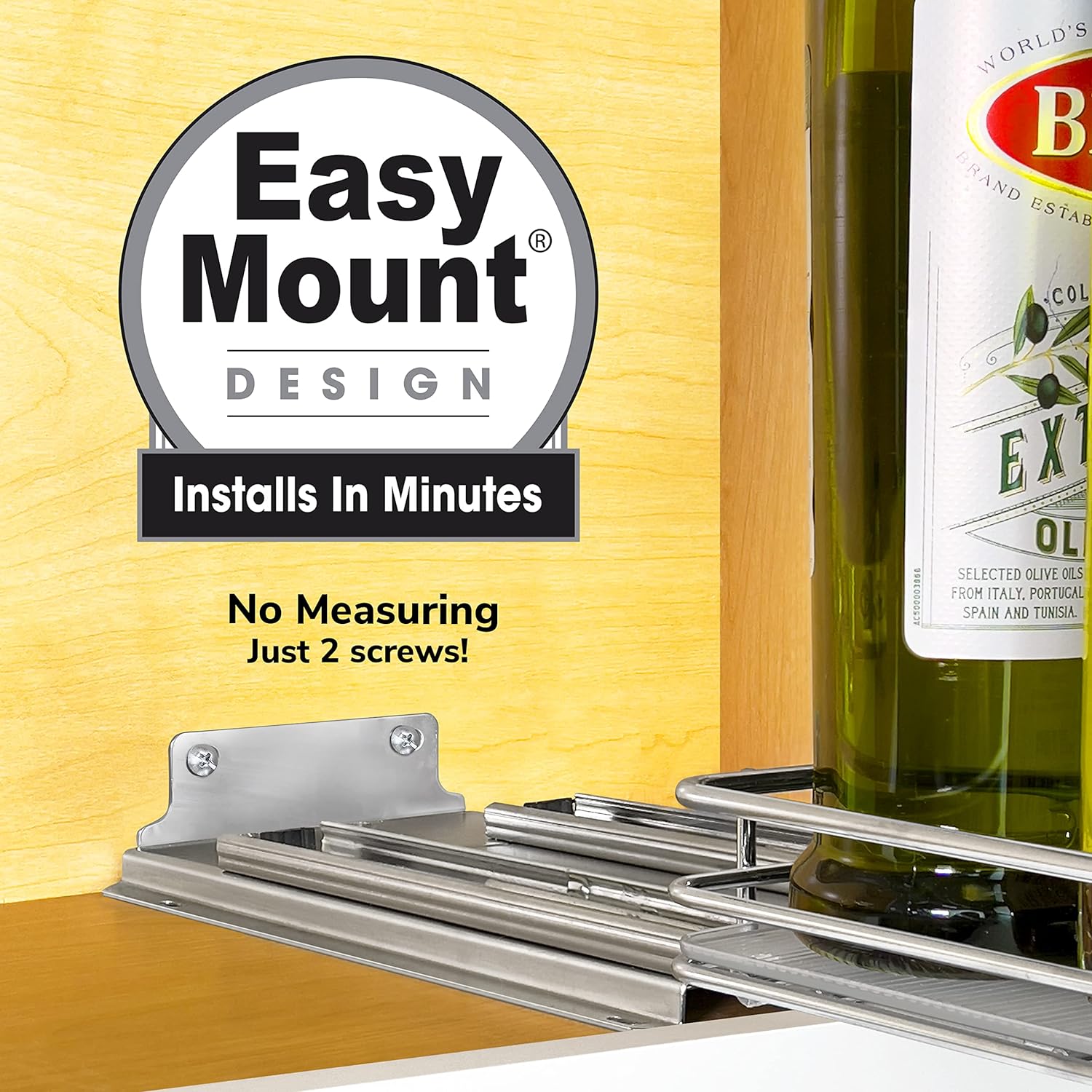 • SETUP IS A BREEZE! – no struggling within limited space trying to place four awkward and difficult to reach screws inside your upper cabinets or into pantry shelves – our exclusive EASY MOUNT cabinet friendly drawer design installs with just two screws in the easily accessible back of your narrow cabinets – in minutes with no measuring!