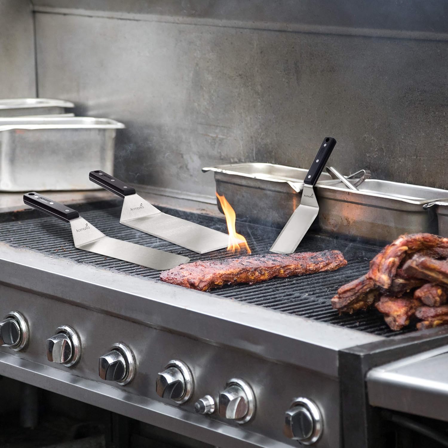 • Food safe stainless steel - griddle utensil set is made of durable non-reactive stainless steel featuring 1 long ​metal spatula​, 1 ​grill flat top spatula​ and 1 griddle scraper commercial