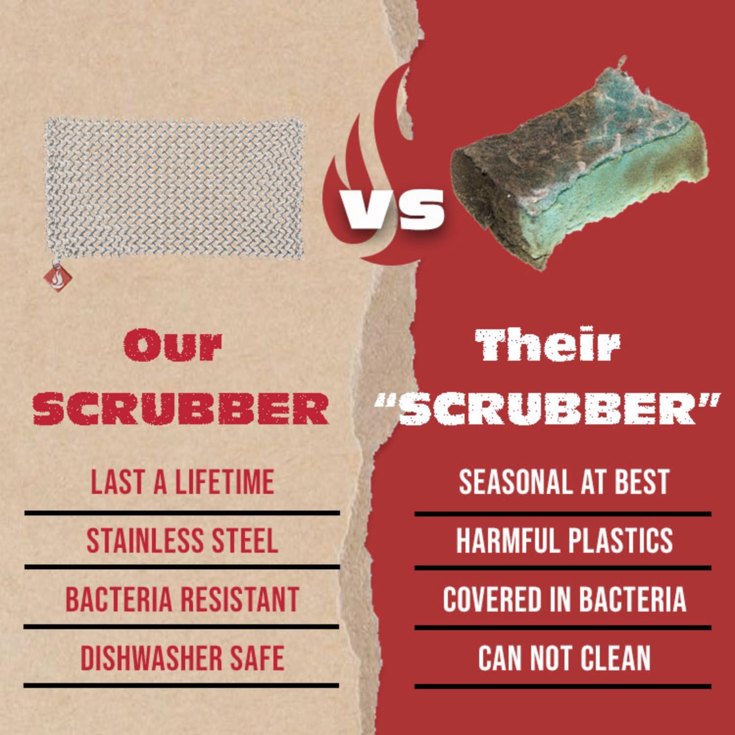 • DELIVERING A LIFETIME OF QUALITY AND RESULTS. Our cast iron cleaner chainmail scrubber is Engineered for precision Backed for a lifetime Industry leader for cast iron, stainless steel, hard anodized cookware.